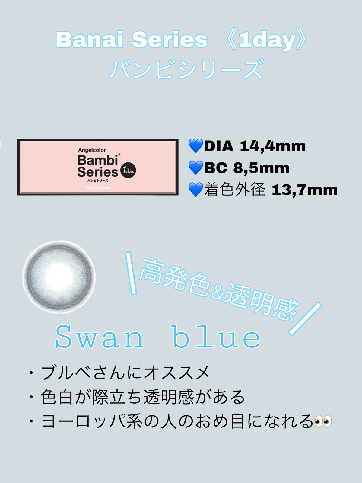 \儚げな白っぽブルーで魅せる、透明感爆誕うるうるeye/𓂃𓂃𓂃𓂃𓂃𓂃𓂃𓂃𓂃𓂃𓂃𓂃𓂃𓂃BambiSeriesSwanBlue𓂃𓂃𓂃𓂃𓂃𓂃𓂃𓂃𓂃𓂃𓂃𓂃𓂃𓂃-SPEC-▫️DIA:14.4mm▫️着色直径:13.7mm▫️度数:±0.00~-10....