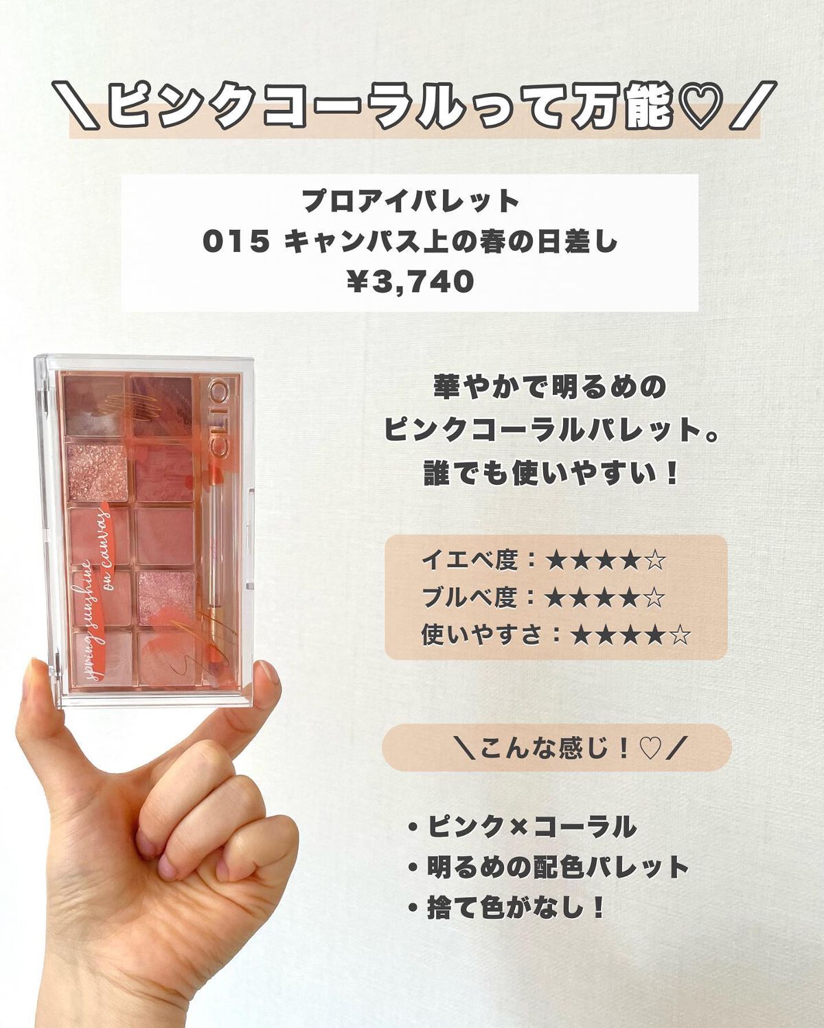 みなさまこんばんは🌙Kanakoです🧸🌼 本日はだいすきなクリオの中でも格段に使いやすい万能カラーのご紹介🫶🏻 全部持ってるわたしがオススメするので🤧🤍 ◼︎CLIOプロアイパレット¥3,740 みんなはどれが気になった?🫶🏻 コメント欄で教えてください!✍️