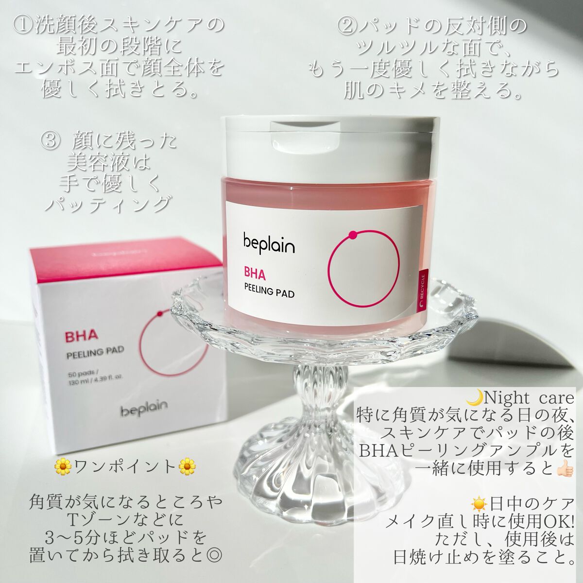 BHA(バハ)成分がたっぷりのトナーパッド💓 角質をためず優しく拭くだけでツヤツヤ肌にリセットしてくれる👏 ひたひたで摩擦レス👏 なんなら顔拭き取った後に、両腕まで拭き取れました🤣 朝晩気にせず使えるようです✨ もちろんペタッとはって部分パックにするのもよし👏