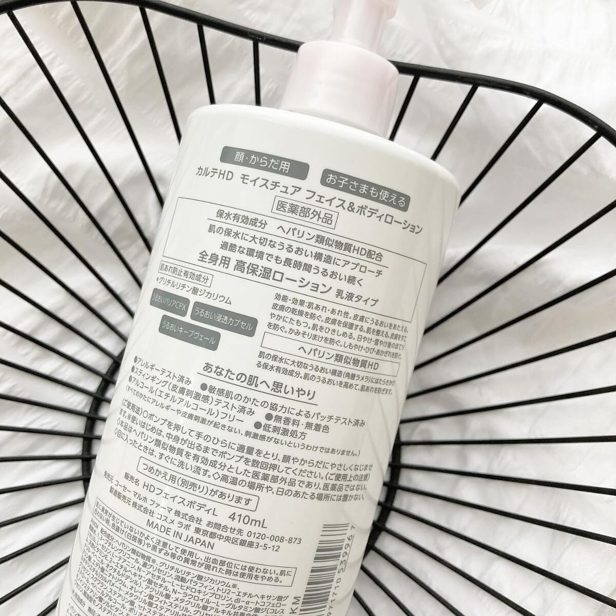 - 【高保湿フェイス&ボディローション】 顔にもからだにも。しっとりやわらか肌つづく。 信頼の保水有効成分「ヘパリン類似物質HD※」配合、低刺激処方の高機能フェイス&ボディローションです。 ヘパリン類似物質HDが、気温・湿度の変化で乾燥しやすいからだの肌のうるおい構造(角層ラメラ)を立て直し、しっとりやわらか肌に導きます。 2種のこだわりオイル配合で、しっとりするのにべたつかず、なめらかにのびひろがる使用感。敏感な肌でもまさつによるストレスがなく、全身をうるおいで満たします。 カルテHDシリーズとしては初めてお子さま(3歳以上)にもお使いいただける商品。 ・ボトルタイプ(220mL) ・ポンプタイプ(410mL) ・つめかえ用(370mL)の3種でラインアップ。 ご自身の保湿に、ご家族や大切なかたの保湿に。みずみずしくなめらかなうるおいが全身を包み込むフェイス&ボディローションです。 ※保水有効成分ヘパリン類似物質のこと <販売名:HD フェイスボディL>