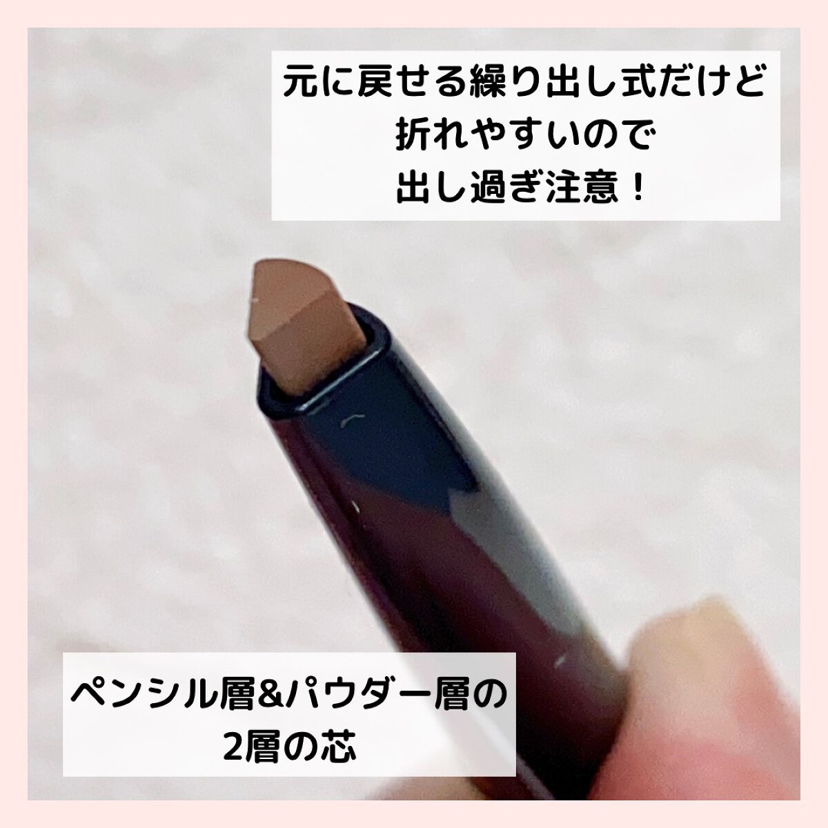 ブラシ付きでこれ一本で手軽に誰でもふんわりこなれ眉になれるアイテム! 描いた後に付属のブラシでぼかすことで、自然なパウダリー仕上がりになるよ~! 太さ調整可能な楕円形の芯が細くも描けるし、まゆの隙間を埋めたり太く書いたりにとても使いやすかったです。