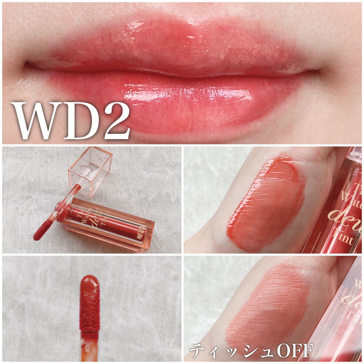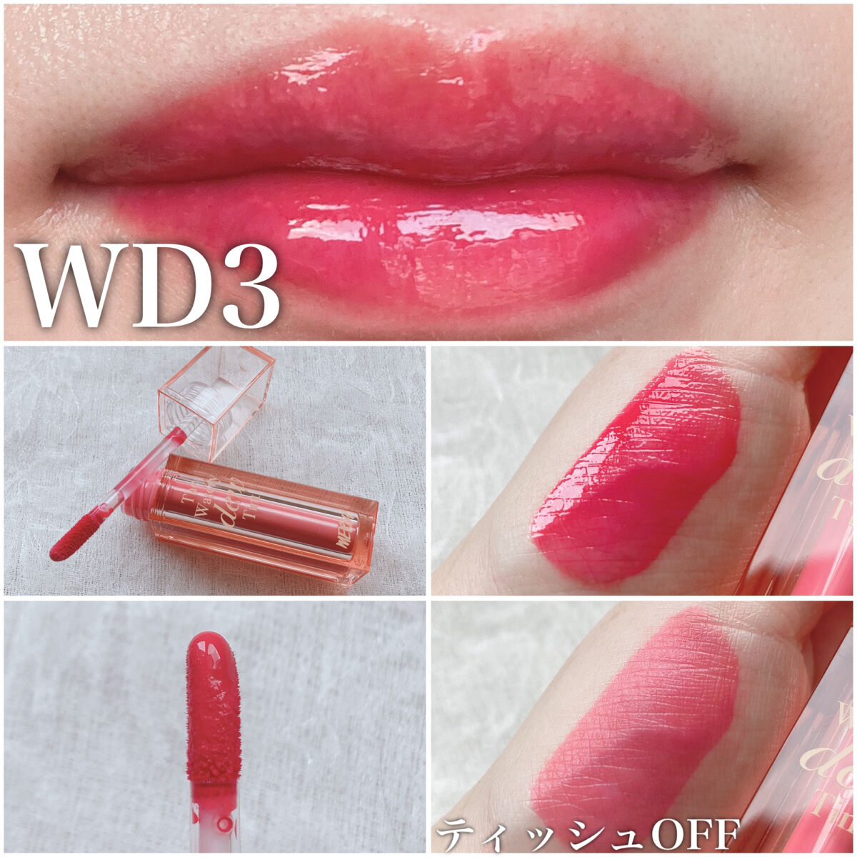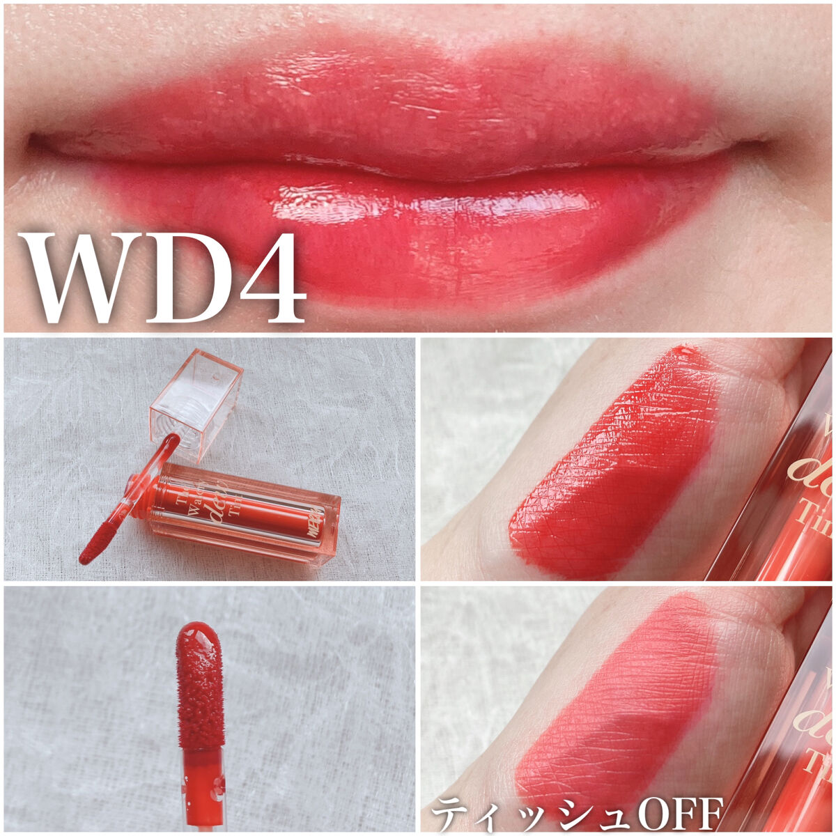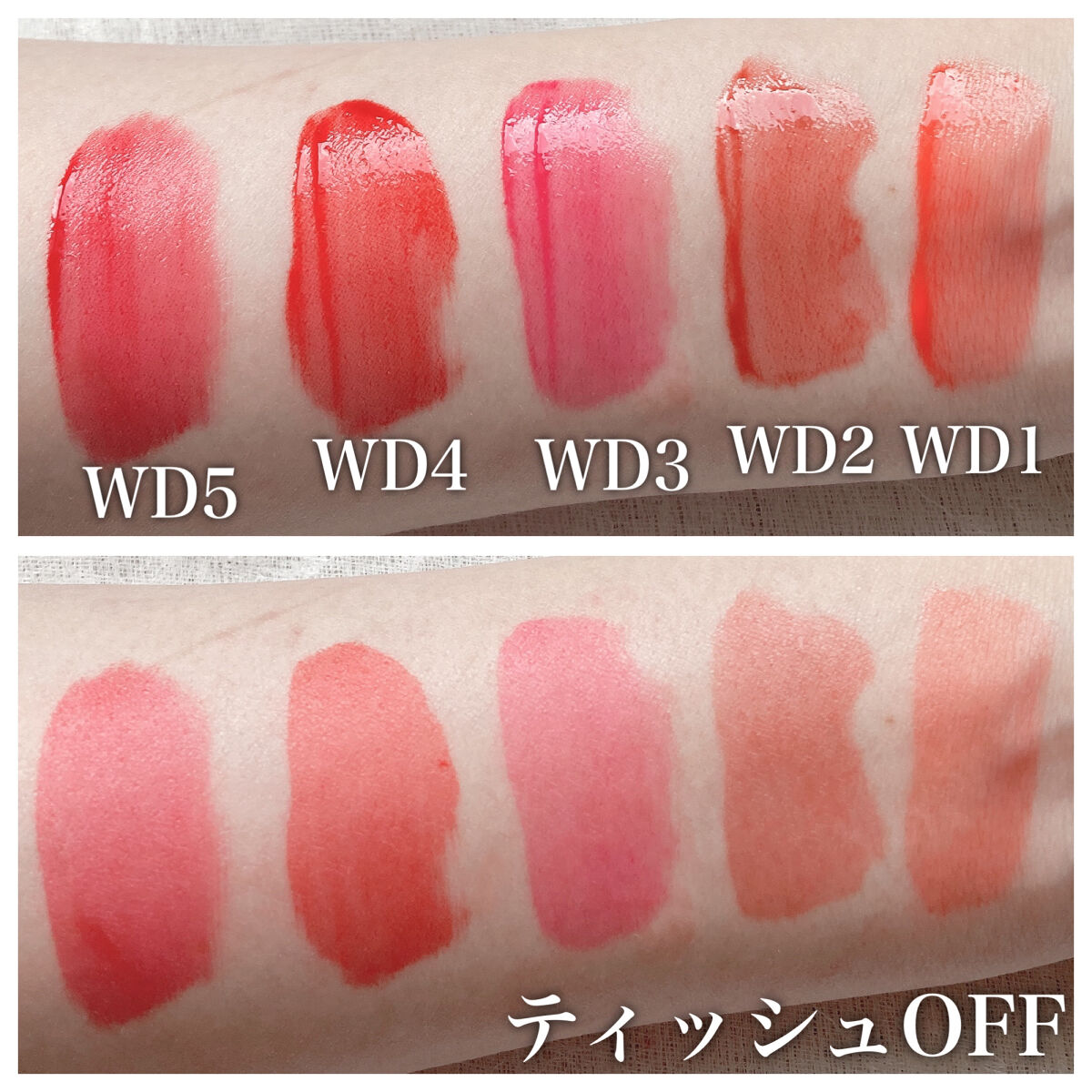 - <WD2 ビトゥン ローズ> 水、ジフェニルジメチコン、リンゴ酸ジイソステアリル、ビスジグリセリルポリアシルアジペート-2、水添ポリイソブテン、ジグリセリン、DPG、セチルPEG/PPG-10/1ジメチコン、イソステアリン酸ソルビタン、ポリソルベート60、ペンチレングリコール、オクチルドデカノール、セテアレス-20、(アクリル酸ヒドロキシエチル/アクリロイルジメチルタウリンNa)コポリマー、スクワラン、フェノキシエタノール、ポリグリセリン-3、ステビオシド、香料、エチルヘキシルグリセリン、グリセリン、シア脂、ツバキ種子油、トリ(カプリル酸/カプリン酸)グリセリル、アルガニアスピノサ核油、ホホバ種子油、アーモンド油、アンズ核油、月見草油、オリーブ果実油、テトラ(ジ-t-ブチルヒドロキシヒドロケイヒ酸)ペンタエリスリチル、カニナバラ果実エキス、マンゴー果実エキス、赤104(1)、赤227、黄5、青1 <WD3 ピンク ヘイズ> 水、ジフェニルジメチコン、リンゴ酸ジイソステアリル、ビスジグリセリルポリアシルアジペート-2、水添ポリイソブテン、ジグリセリン、DPG、セチルPEG/PPG-10/1ジメチコン、イソステアリン酸ソルビタン、ポリソルベート60、ペンチレングリコール、オクチルドデカノール、セテアレス-20、(アクリル酸ヒドロキシエチル/アクリロイルジメチルタウリンNa)コポリマー、スクワラン、フェノキシエタノール、ポリグリセリン-3、ステビオシド、香料、エチルヘキシルグリセリン、グリセリン、水酸化Al、ポリアクリル酸アンモニウム、BG、アルガニアスピノサ核油、シア脂、ツバキ種子油、トリ(カプリル酸/カプリン酸)グリセリル、アーモンド油、アンズ核油、ホホバ種子油、月見草油、オリーブ果実油、テトラ(ジ-t-ブチルヒドロキシヒドロケイヒ酸)ペンタエリスリチル、マンゴー果実エキス、カニナバラ果実エキス、酸化チタン、赤104(1)、赤227、黄5、青1 <WD4 オールウェイズ ヤング> 水、ジフェニルジメチコン、リンゴ酸ジイソステアリル、ビスジグリセリルポリアシルアジペート-2、水添ポリイソブテン、ジグリセリン、DPG、セチルPEG/PPG-10/1ジメチコン、イソステアリン酸ソルビタン、ポリソルベート60、ペンチレングリコール、オクチルドデカノール、セテアレス-20、(アクリル酸ヒドロキシエチル/アクリロイルジメチルタウリンNa)コポリマー、スクワラン、フェノキシエタノール、ポリグリセリン-3、ステビオシド、香料、エチルヘキシルグリセリン、グリセリン、シア脂、ツバキ種子油、トリ(カプリル酸/カプリン酸)グリセリル、アルガニアスピノサ核油、ホホバ種子油、アーモンド油、アンズ核油、月見草油、オリーブ果実油、テトラ(ジ-t-ブチルヒドロキシヒドロケイヒ酸)ペンタエリスリチル、カニナバラ果実エキス、マンゴー果実エキス、赤104(1)、赤227、黄5、青1 <WD6 クラッシュド パンプキン> 水、水添ポリイソブテン、リンゴ酸ジイソステアリル、ビスジグリセリルポリアシルアジペート-2、ジフェニルシロキシフェニルトリメチコン、ジフェニルジメチコン、ポリグリセリン-3、オクチルドデカノール、ポリソルベート60、セチルPEG/PPG-10/1ジメチコン、ラウリン酸ポリグリセリル-10、ペンチレングリコール、1,2-ヘキサンジオール、(アクリル酸ヒドロキシエチル/アクリロイルジメチルタウリンNa)コポリマー、PEG-60水添ヒマシ油、セテアリルアルコール、スクワラン、キシリトール、エチルヘキシルグリセリン、香料、ポリアクリル酸アンモニウム、イソステアリン酸ソルビタン、水酸化Al、フェノキシエタノール、BG、トコフェロール、酸化チタン、酸化鉄、赤227、黄4、黄5、青1 <WD8 ビンテージ カラント> 水、水添ポリイソブテン、リンゴ酸ジイソステアリル、ビスジグリセリルポリアシルアジペート-2、ジフェニルシロキシフェニルトリメチコン、ジフェニルジメチコン、オクチルドデカノール、ポリグリセリン-3、ポリソルベート60、セチルPEG/PPG-10/1ジメチコン、ラウリン酸ポリグリセリル-10、1,2-ヘキサンジオール、ペンチレングリコール、(アクリル酸ヒドロキシエチル/アクリロイルジメチルタウリンNa)コポリマー、PEG-60水添ヒマシ油、セテアリルアルコール、スクワラン、キシリトール、エチルヘキシルグリセリン、香料、イソステアリン酸ソルビタン、トコフェロール、赤104(1)、赤227、黄5、青1 <WD9 ミスター ストレンジャー> 水、水添ポリイソブテン、リンゴ酸ジイソステアリル、ビスジグリセリルポリアシルアジペート-2、ジフェニルシロキシフェニルトリメチコン、ジフェニルジメチコン、オクチルドデカノール、ポリグリセリン-3、ポリソルベート60、セチルPEG/PPG-10/1ジメチコン、ラウリン酸ポリグリセリル-10、1,2-ヘキサンジオール、ペンチレングリコール、(アクリル酸ヒドロキシエチル/アクリロイルジメチルタウリンNa)コポリマー、セテアリルアルコール、PEG-60水添ヒマシ油、スクワラン、キシリトール、エチルヘキシルグリセリン、香料、イソステアリン酸ソルビタン、水酸化Al、ポ