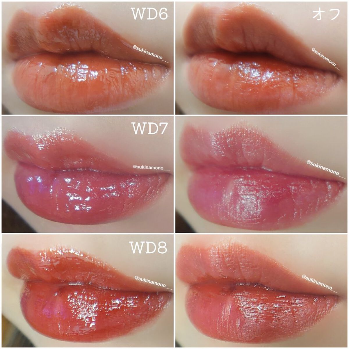 - <WD2 ビトゥン ローズ> 水、ジフェニルジメチコン、リンゴ酸ジイソステアリル、ビスジグリセリルポリアシルアジペート-2、水添ポリイソブテン、ジグリセリン、DPG、セチルPEG/PPG-10/1ジメチコン、イソステアリン酸ソルビタン、ポリソルベート60、ペンチレングリコール、オクチルドデカノール、セテアレス-20、(アクリル酸ヒドロキシエチル/アクリロイルジメチルタウリンNa)コポリマー、スクワラン、フェノキシエタノール、ポリグリセリン-3、ステビオシド、香料、エチルヘキシルグリセリン、グリセリン、シア脂、ツバキ種子油、トリ(カプリル酸/カプリン酸)グリセリル、アルガニアスピノサ核油、ホホバ種子油、アーモンド油、アンズ核油、月見草油、オリーブ果実油、テトラ(ジ-t-ブチルヒドロキシヒドロケイヒ酸)ペンタエリスリチル、カニナバラ果実エキス、マンゴー果実エキス、赤104(1)、赤227、黄5、青1 <WD3 ピンク ヘイズ> 水、ジフェニルジメチコン、リンゴ酸ジイソステアリル、ビスジグリセリルポリアシルアジペート-2、水添ポリイソブテン、ジグリセリン、DPG、セチルPEG/PPG-10/1ジメチコン、イソステアリン酸ソルビタン、ポリソルベート60、ペンチレングリコール、オクチルドデカノール、セテアレス-20、(アクリル酸ヒドロキシエチル/アクリロイルジメチルタウリンNa)コポリマー、スクワラン、フェノキシエタノール、ポリグリセリン-3、ステビオシド、香料、エチルヘキシルグリセリン、グリセリン、水酸化Al、ポリアクリル酸アンモニウム、BG、アルガニアスピノサ核油、シア脂、ツバキ種子油、トリ(カプリル酸/カプリン酸)グリセリル、アーモンド油、アンズ核油、ホホバ種子油、月見草油、オリーブ果実油、テトラ(ジ-t-ブチルヒドロキシヒドロケイヒ酸)ペンタエリスリチル、マンゴー果実エキス、カニナバラ果実エキス、酸化チタン、赤104(1)、赤227、黄5、青1 <WD4 オールウェイズ ヤング> 水、ジフェニルジメチコン、リンゴ酸ジイソステアリル、ビスジグリセリルポリアシルアジペート-2、水添ポリイソブテン、ジグリセリン、DPG、セチルPEG/PPG-10/1ジメチコン、イソステアリン酸ソルビタン、ポリソルベート60、ペンチレングリコール、オクチルドデカノール、セテアレス-20、(アクリル酸ヒドロキシエチル/アクリロイルジメチルタウリンNa)コポリマー、スクワラン、フェノキシエタノール、ポリグリセリン-3、ステビオシド、香料、エチルヘキシルグリセリン、グリセリン、シア脂、ツバキ種子油、トリ(カプリル酸/カプリン酸)グリセリル、アルガニアスピノサ核油、ホホバ種子油、アーモンド油、アンズ核油、月見草油、オリーブ果実油、テトラ(ジ-t-ブチルヒドロキシヒドロケイヒ酸)ペンタエリスリチル、カニナバラ果実エキス、マンゴー果実エキス、赤104(1)、赤227、黄5、青1 <WD6 クラッシュド パンプキン> 水、水添ポリイソブテン、リンゴ酸ジイソステアリル、ビスジグリセリルポリアシルアジペート-2、ジフェニルシロキシフェニルトリメチコン、ジフェニルジメチコン、ポリグリセリン-3、オクチルドデカノール、ポリソルベート60、セチルPEG/PPG-10/1ジメチコン、ラウリン酸ポリグリセリル-10、ペンチレングリコール、1,2-ヘキサンジオール、(アクリル酸ヒドロキシエチル/アクリロイルジメチルタウリンNa)コポリマー、PEG-60水添ヒマシ油、セテアリルアルコール、スクワラン、キシリトール、エチルヘキシルグリセリン、香料、ポリアクリル酸アンモニウム、イソステアリン酸ソルビタン、水酸化Al、フェノキシエタノール、BG、トコフェロール、酸化チタン、酸化鉄、赤227、黄4、黄5、青1 <WD8 ビンテージ カラント> 水、水添ポリイソブテン、リンゴ酸ジイソステアリル、ビスジグリセリルポリアシルアジペート-2、ジフェニルシロキシフェニルトリメチコン、ジフェニルジメチコン、オクチルドデカノール、ポリグリセリン-3、ポリソルベート60、セチルPEG/PPG-10/1ジメチコン、ラウリン酸ポリグリセリル-10、1,2-ヘキサンジオール、ペンチレングリコール、(アクリル酸ヒドロキシエチル/アクリロイルジメチルタウリンNa)コポリマー、PEG-60水添ヒマシ油、セテアリルアルコール、スクワラン、キシリトール、エチルヘキシルグリセリン、香料、イソステアリン酸ソルビタン、トコフェロール、赤104(1)、赤227、黄5、青1 <WD9 ミスター ストレンジャー> 水、水添ポリイソブテン、リンゴ酸ジイソステアリル、ビスジグリセリルポリアシルアジペート-2、ジフェニルシロキシフェニルトリメチコン、ジフェニルジメチコン、オクチルドデカノール、ポリグリセリン-3、ポリソルベート60、セチルPEG/PPG-10/1ジメチコン、ラウリン酸ポリグリセリル-10、1,2-ヘキサンジオール、ペンチレングリコール、(アクリル酸ヒドロキシエチル/アクリロイルジメチルタウリンNa)コポリマー、セテアリルアルコール、PEG-60水添ヒマシ油、スクワラン、キシリトール、エチルヘキシルグリセリン、香料、イソステアリン酸ソルビタン、水酸化Al、ポ