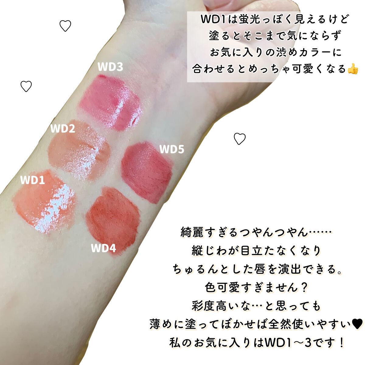- <WD2 ビトゥン ローズ> 水、ジフェニルジメチコン、リンゴ酸ジイソステアリル、ビスジグリセリルポリアシルアジペート-2、水添ポリイソブテン、ジグリセリン、DPG、セチルPEG/PPG-10/1ジメチコン、イソステアリン酸ソルビタン、ポリソルベート60、ペンチレングリコール、オクチルドデカノール、セテアレス-20、(アクリル酸ヒドロキシエチル/アクリロイルジメチルタウリンNa)コポリマー、スクワラン、フェノキシエタノール、ポリグリセリン-3、ステビオシド、香料、エチルヘキシルグリセリン、グリセリン、シア脂、ツバキ種子油、トリ(カプリル酸/カプリン酸)グリセリル、アルガニアスピノサ核油、ホホバ種子油、アーモンド油、アンズ核油、月見草油、オリーブ果実油、テトラ(ジ-t-ブチルヒドロキシヒドロケイヒ酸)ペンタエリスリチル、カニナバラ果実エキス、マンゴー果実エキス、赤104(1)、赤227、黄5、青1 <WD3 ピンク ヘイズ> 水、ジフェニルジメチコン、リンゴ酸ジイソステアリル、ビスジグリセリルポリアシルアジペート-2、水添ポリイソブテン、ジグリセリン、DPG、セチルPEG/PPG-10/1ジメチコン、イソステアリン酸ソルビタン、ポリソルベート60、ペンチレングリコール、オクチルドデカノール、セテアレス-20、(アクリル酸ヒドロキシエチル/アクリロイルジメチルタウリンNa)コポリマー、スクワラン、フェノキシエタノール、ポリグリセリン-3、ステビオシド、香料、エチルヘキシルグリセリン、グリセリン、水酸化Al、ポリアクリル酸アンモニウム、BG、アルガニアスピノサ核油、シア脂、ツバキ種子油、トリ(カプリル酸/カプリン酸)グリセリル、アーモンド油、アンズ核油、ホホバ種子油、月見草油、オリーブ果実油、テトラ(ジ-t-ブチルヒドロキシヒドロケイヒ酸)ペンタエリスリチル、マンゴー果実エキス、カニナバラ果実エキス、酸化チタン、赤104(1)、赤227、黄5、青1 <WD4 オールウェイズ ヤング> 水、ジフェニルジメチコン、リンゴ酸ジイソステアリル、ビスジグリセリルポリアシルアジペート-2、水添ポリイソブテン、ジグリセリン、DPG、セチルPEG/PPG-10/1ジメチコン、イソステアリン酸ソルビタン、ポリソルベート60、ペンチレングリコール、オクチルドデカノール、セテアレス-20、(アクリル酸ヒドロキシエチル/アクリロイルジメチルタウリンNa)コポリマー、スクワラン、フェノキシエタノール、ポリグリセリン-3、ステビオシド、香料、エチルヘキシルグリセリン、グリセリン、シア脂、ツバキ種子油、トリ(カプリル酸/カプリン酸)グリセリル、アルガニアスピノサ核油、ホホバ種子油、アーモンド油、アンズ核油、月見草油、オリーブ果実油、テトラ(ジ-t-ブチルヒドロキシヒドロケイヒ酸)ペンタエリスリチル、カニナバラ果実エキス、マンゴー果実エキス、赤104(1)、赤227、黄5、青1 <WD6 クラッシュド パンプキン> 水、水添ポリイソブテン、リンゴ酸ジイソステアリル、ビスジグリセリルポリアシルアジペート-2、ジフェニルシロキシフェニルトリメチコン、ジフェニルジメチコン、ポリグリセリン-3、オクチルドデカノール、ポリソルベート60、セチルPEG/PPG-10/1ジメチコン、ラウリン酸ポリグリセリル-10、ペンチレングリコール、1,2-ヘキサンジオール、(アクリル酸ヒドロキシエチル/アクリロイルジメチルタウリンNa)コポリマー、PEG-60水添ヒマシ油、セテアリルアルコール、スクワラン、キシリトール、エチルヘキシルグリセリン、香料、ポリアクリル酸アンモニウム、イソステアリン酸ソルビタン、水酸化Al、フェノキシエタノール、BG、トコフェロール、酸化チタン、酸化鉄、赤227、黄4、黄5、青1 <WD8 ビンテージ カラント> 水、水添ポリイソブテン、リンゴ酸ジイソステアリル、ビスジグリセリルポリアシルアジペート-2、ジフェニルシロキシフェニルトリメチコン、ジフェニルジメチコン、オクチルドデカノール、ポリグリセリン-3、ポリソルベート60、セチルPEG/PPG-10/1ジメチコン、ラウリン酸ポリグリセリル-10、1,2-ヘキサンジオール、ペンチレングリコール、(アクリル酸ヒドロキシエチル/アクリロイルジメチルタウリンNa)コポリマー、PEG-60水添ヒマシ油、セテアリルアルコール、スクワラン、キシリトール、エチルヘキシルグリセリン、香料、イソステアリン酸ソルビタン、トコフェロール、赤104(1)、赤227、黄5、青1 <WD9 ミスター ストレンジャー> 水、水添ポリイソブテン、リンゴ酸ジイソステアリル、ビスジグリセリルポリアシルアジペート-2、ジフェニルシロキシフェニルトリメチコン、ジフェニルジメチコン、オクチルドデカノール、ポリグリセリン-3、ポリソルベート60、セチルPEG/PPG-10/1ジメチコン、ラウリン酸ポリグリセリル-10、1,2-ヘキサンジオール、ペンチレングリコール、(アクリル酸ヒドロキシエチル/アクリロイルジメチルタウリンNa)コポリマー、セテアリルアルコール、PEG-60水添ヒマシ油、スクワラン、キシリトール、エチルヘキシルグリセリン、香料、イソステアリン酸ソルビタン、水酸化Al、ポ