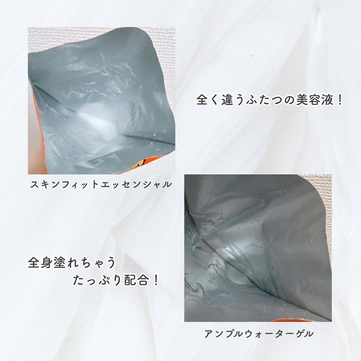 スキンフィットエッセンシャルマスク たるんだ肌に弾力アップ! 鎮静ケア成分配合の もちっとした乳白色のエッセンス。 健康でしっかりした肌バリア保護膜を形成✨ 肌のバリア機能を強化し カサカサになったお肌に しっとりもっちり潤います☺️✨ アンプルウォーターゲルマスク お肌の奥までしっとり、うるおい、浸透✨ 85%の高濃縮水分アンプル30gを 含んだシートが、水分補給を助け しっとり肌に仕上げます。 AHA/BHA/PHAピーリング成分が 肌の上の角質をやさしくケアし なめらかな肌に仕上げます😊✨ どちらも肌に優しいビーガン認証シートで お顔にピタッとフィットします🧡