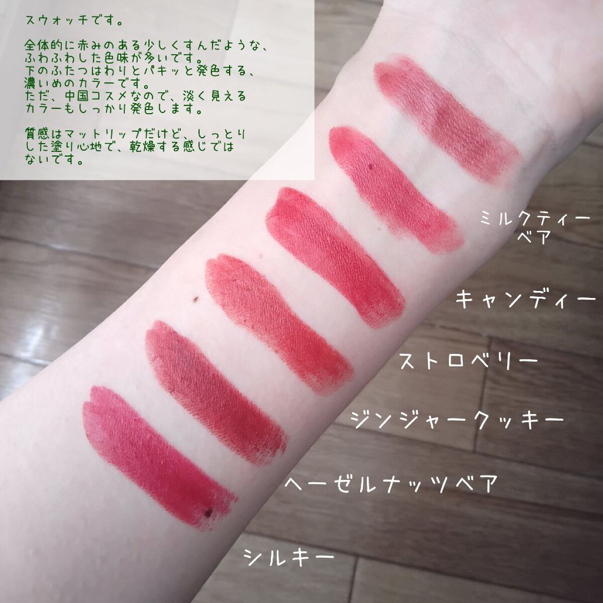 デザイン以外は見た目や重さには違いはないので、細身で持ちやすく使いやすいです☆ リップの色味は見比べると、やはりマットの方はぱきっとした秋冬向きの色が多いです。マットの1、2は多少くすみはありますが、万能カラーな気がします。 グロッシーはスウォッチだと、わりとナチュラルなカラーが多く見えますが、実際リップにのせるとそれぞれ違う色でしっかり発色します! マットもパサつかず、すごくしっとりした感じで、鮮やかに発色します。 塗り心地はグロッシーはスルスル塗れて、マットはふわふわしています。 個人的にはマットの塗り心地好きです。 ただ、グロッシーは潤いがある軽いテクスチャーなのもあって、マスクには弱いです。 マットも強いわけではないんですが、グロッシーでマスクすると結構落ちます、、😢 マットはマットでにじむし、濃い色だと口の回りにリップがのびてしまい、、 どちらもマスクにはあまり向かないかな、