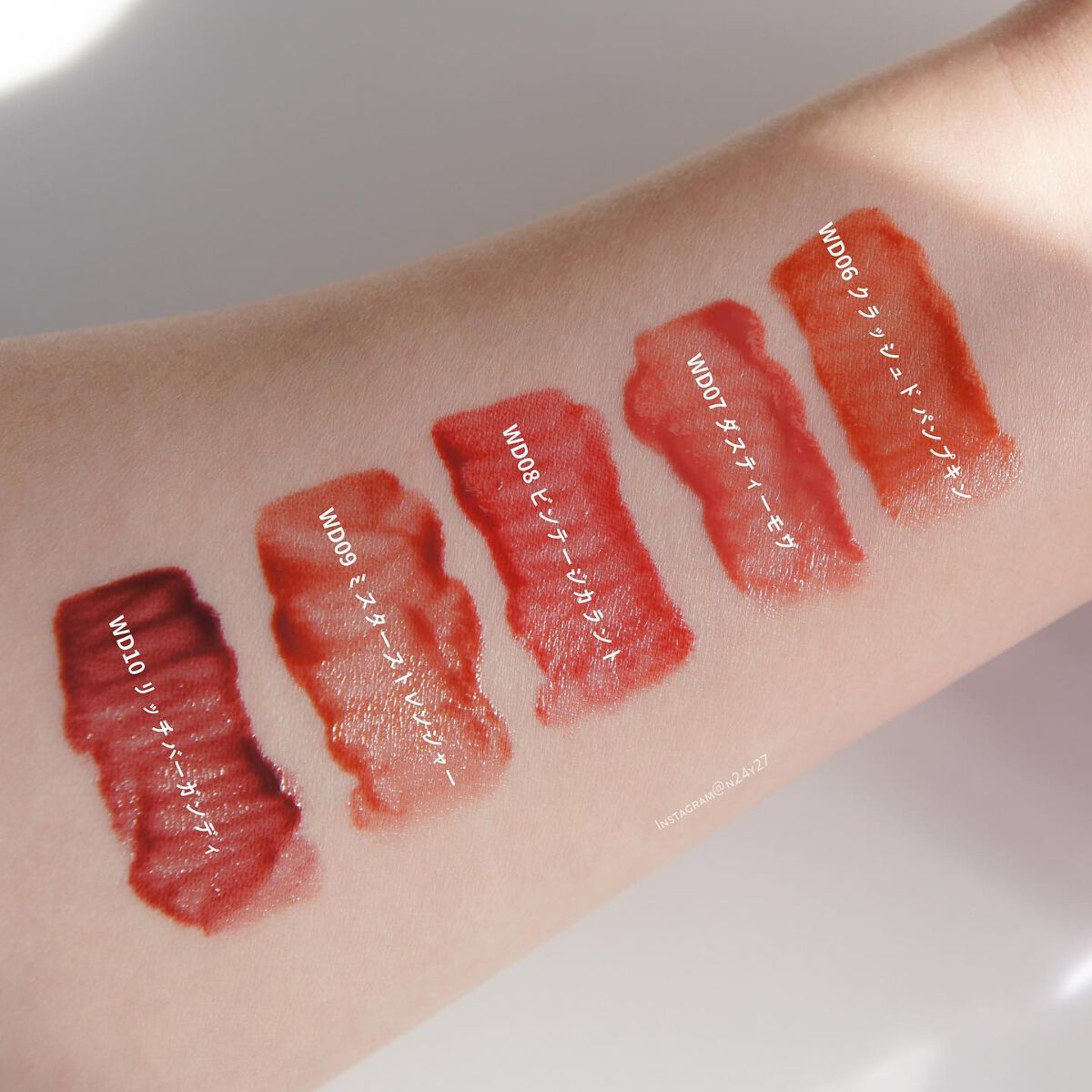 - <WD2 ビトゥン ローズ> 水、ジフェニルジメチコン、リンゴ酸ジイソステアリル、ビスジグリセリルポリアシルアジペート-2、水添ポリイソブテン、ジグリセリン、DPG、セチルPEG/PPG-10/1ジメチコン、イソステアリン酸ソルビタン、ポリソルベート60、ペンチレングリコール、オクチルドデカノール、セテアレス-20、(アクリル酸ヒドロキシエチル/アクリロイルジメチルタウリンNa)コポリマー、スクワラン、フェノキシエタノール、ポリグリセリン-3、ステビオシド、香料、エチルヘキシルグリセリン、グリセリン、シア脂、ツバキ種子油、トリ(カプリル酸/カプリン酸)グリセリル、アルガニアスピノサ核油、ホホバ種子油、アーモンド油、アンズ核油、月見草油、オリーブ果実油、テトラ(ジ-t-ブチルヒドロキシヒドロケイヒ酸)ペンタエリスリチル、カニナバラ果実エキス、マンゴー果実エキス、赤104(1)、赤227、黄5、青1 <WD3 ピンク ヘイズ> 水、ジフェニルジメチコン、リンゴ酸ジイソステアリル、ビスジグリセリルポリアシルアジペート-2、水添ポリイソブテン、ジグリセリン、DPG、セチルPEG/PPG-10/1ジメチコン、イソステアリン酸ソルビタン、ポリソルベート60、ペンチレングリコール、オクチルドデカノール、セテアレス-20、(アクリル酸ヒドロキシエチル/アクリロイルジメチルタウリンNa)コポリマー、スクワラン、フェノキシエタノール、ポリグリセリン-3、ステビオシド、香料、エチルヘキシルグリセリン、グリセリン、水酸化Al、ポリアクリル酸アンモニウム、BG、アルガニアスピノサ核油、シア脂、ツバキ種子油、トリ(カプリル酸/カプリン酸)グリセリル、アーモンド油、アンズ核油、ホホバ種子油、月見草油、オリーブ果実油、テトラ(ジ-t-ブチルヒドロキシヒドロケイヒ酸)ペンタエリスリチル、マンゴー果実エキス、カニナバラ果実エキス、酸化チタン、赤104(1)、赤227、黄5、青1 <WD4 オールウェイズ ヤング> 水、ジフェニルジメチコン、リンゴ酸ジイソステアリル、ビスジグリセリルポリアシルアジペート-2、水添ポリイソブテン、ジグリセリン、DPG、セチルPEG/PPG-10/1ジメチコン、イソステアリン酸ソルビタン、ポリソルベート60、ペンチレングリコール、オクチルドデカノール、セテアレス-20、(アクリル酸ヒドロキシエチル/アクリロイルジメチルタウリンNa)コポリマー、スクワラン、フェノキシエタノール、ポリグリセリン-3、ステビオシド、香料、エチルヘキシルグリセリン、グリセリン、シア脂、ツバキ種子油、トリ(カプリル酸/カプリン酸)グリセリル、アルガニアスピノサ核油、ホホバ種子油、アーモンド油、アンズ核油、月見草油、オリーブ果実油、テトラ(ジ-t-ブチルヒドロキシヒドロケイヒ酸)ペンタエリスリチル、カニナバラ果実エキス、マンゴー果実エキス、赤104(1)、赤227、黄5、青1 <WD6 クラッシュド パンプキン> 水、水添ポリイソブテン、リンゴ酸ジイソステアリル、ビスジグリセリルポリアシルアジペート-2、ジフェニルシロキシフェニルトリメチコン、ジフェニルジメチコン、ポリグリセリン-3、オクチルドデカノール、ポリソルベート60、セチルPEG/PPG-10/1ジメチコン、ラウリン酸ポリグリセリル-10、ペンチレングリコール、1,2-ヘキサンジオール、(アクリル酸ヒドロキシエチル/アクリロイルジメチルタウリンNa)コポリマー、PEG-60水添ヒマシ油、セテアリルアルコール、スクワラン、キシリトール、エチルヘキシルグリセリン、香料、ポリアクリル酸アンモニウム、イソステアリン酸ソルビタン、水酸化Al、フェノキシエタノール、BG、トコフェロール、酸化チタン、酸化鉄、赤227、黄4、黄5、青1 <WD8 ビンテージ カラント> 水、水添ポリイソブテン、リンゴ酸ジイソステアリル、ビスジグリセリルポリアシルアジペート-2、ジフェニルシロキシフェニルトリメチコン、ジフェニルジメチコン、オクチルドデカノール、ポリグリセリン-3、ポリソルベート60、セチルPEG/PPG-10/1ジメチコン、ラウリン酸ポリグリセリル-10、1,2-ヘキサンジオール、ペンチレングリコール、(アクリル酸ヒドロキシエチル/アクリロイルジメチルタウリンNa)コポリマー、PEG-60水添ヒマシ油、セテアリルアルコール、スクワラン、キシリトール、エチルヘキシルグリセリン、香料、イソステアリン酸ソルビタン、トコフェロール、赤104(1)、赤227、黄5、青1 <WD9 ミスター ストレンジャー> 水、水添ポリイソブテン、リンゴ酸ジイソステアリル、ビスジグリセリルポリアシルアジペート-2、ジフェニルシロキシフェニルトリメチコン、ジフェニルジメチコン、オクチルドデカノール、ポリグリセリン-3、ポリソルベート60、セチルPEG/PPG-10/1ジメチコン、ラウリン酸ポリグリセリル-10、1,2-ヘキサンジオール、ペンチレングリコール、(アクリル酸ヒドロキシエチル/アクリロイルジメチルタウリンNa)コポリマー、セテアリルアルコール、PEG-60水添ヒマシ油、スクワラン、キシリトール、エチルヘキシルグリセリン、香料、イソステアリン酸ソルビタン、水酸化Al、ポ