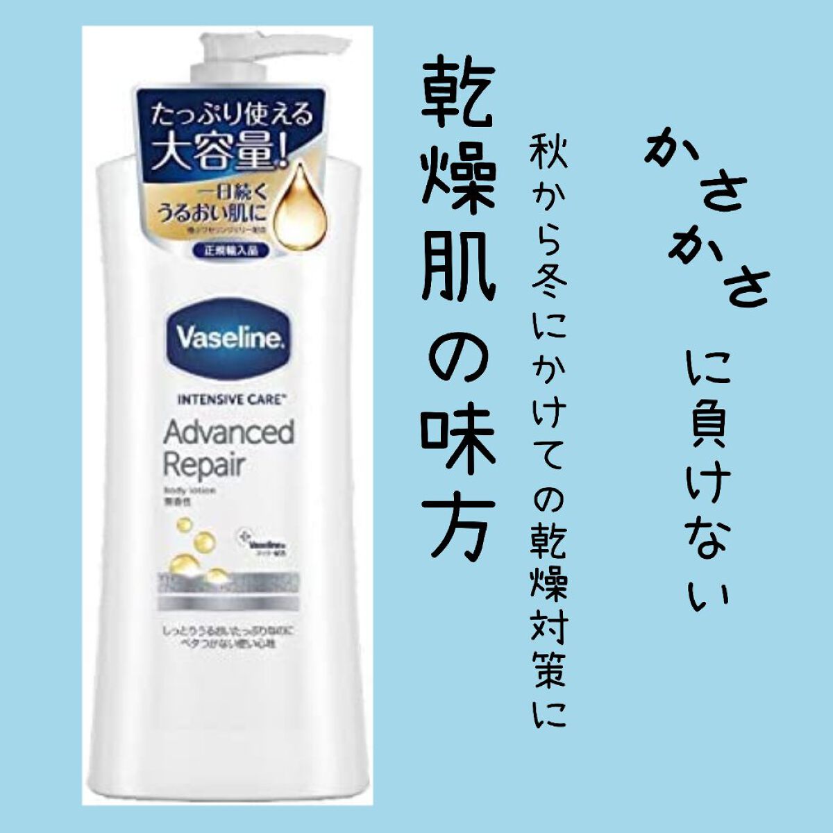 ヴァセリンアドバンスドリペアボディローション400mlアットコスメショッピングで購入しました。(1,078円)肌が弱めの5歳娘と一緒に使用していますが、伸びがよく、翌朝までしっとりします。"セラミド以上の浸透成分配合"というワードの通り、ボデ...