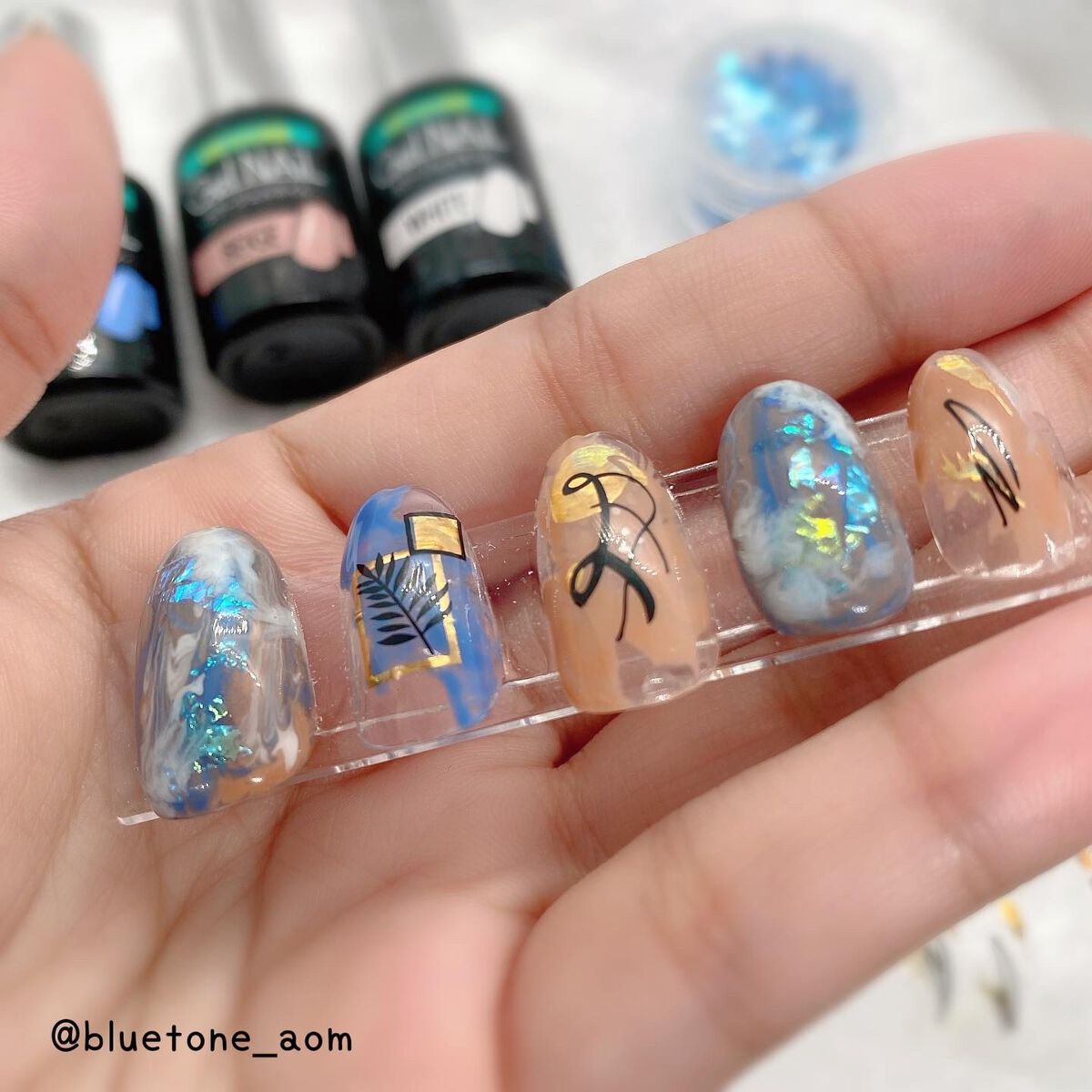 ラメがしっかりしてるし クリアカラーが入ってるから オーロラパウダー無しでも 充分キラキラしました! 反射強めのフィルムなので 実物はもっと うるうるとキラキラが強いです! ビー玉みたい🥺 ネイルシール長持ちさせたいけど ちょっと飽きてきたな〜って時とかに 全然違った印象になるのでオススメです! Seriaのベースジェル 本当にうるうるネイルしやすいので オススメしたい🙆♀️