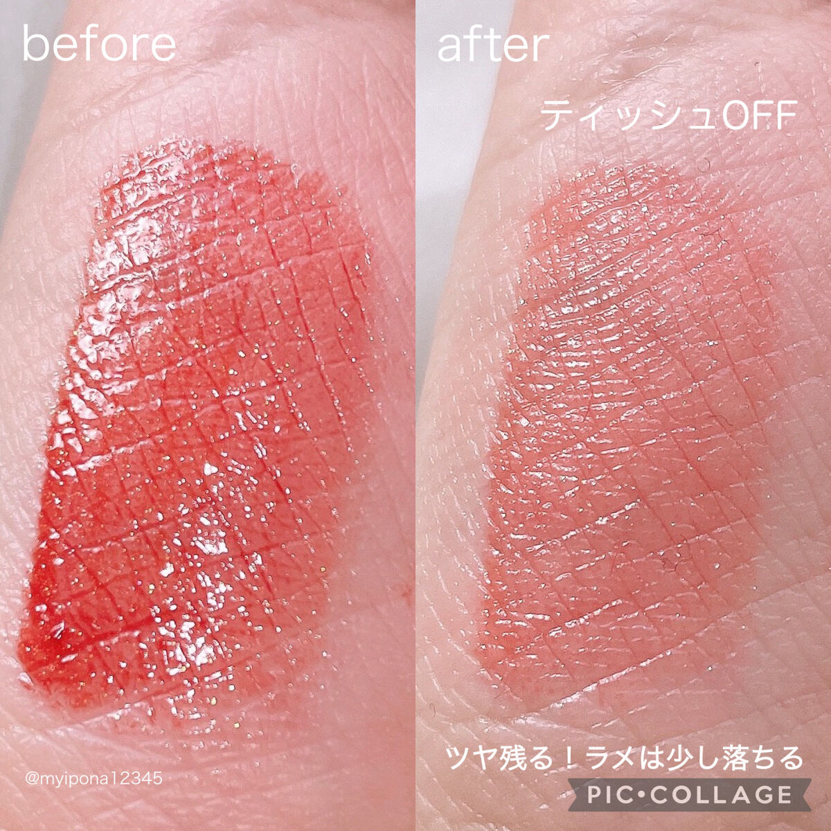 - 軽いオイルテクスチャーでべたつかず色移りが少ない、照り輝くパールコーティングティント。 グリッターパールがぶっくりした唇を、ローズヒップオイルやオリーブオイルやアボカドオイルなどがうるっとした唇を演出。