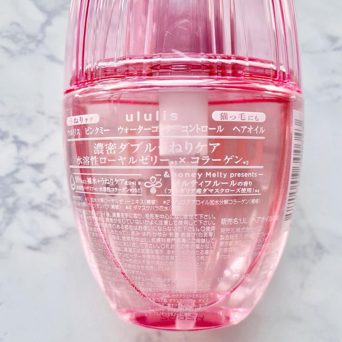 ululisピンクミーウォーターコンクコントロールヘアオイルうるサラ髪濃密ダブルうねりケア水溶性ローヤルゼリー✕コラーゲンメルティフルールの香りポンプタイプですが勢いよく跳ねる場合ありwとてもサラサラで軽いつけ心地のオイルショートやボブぐらい...