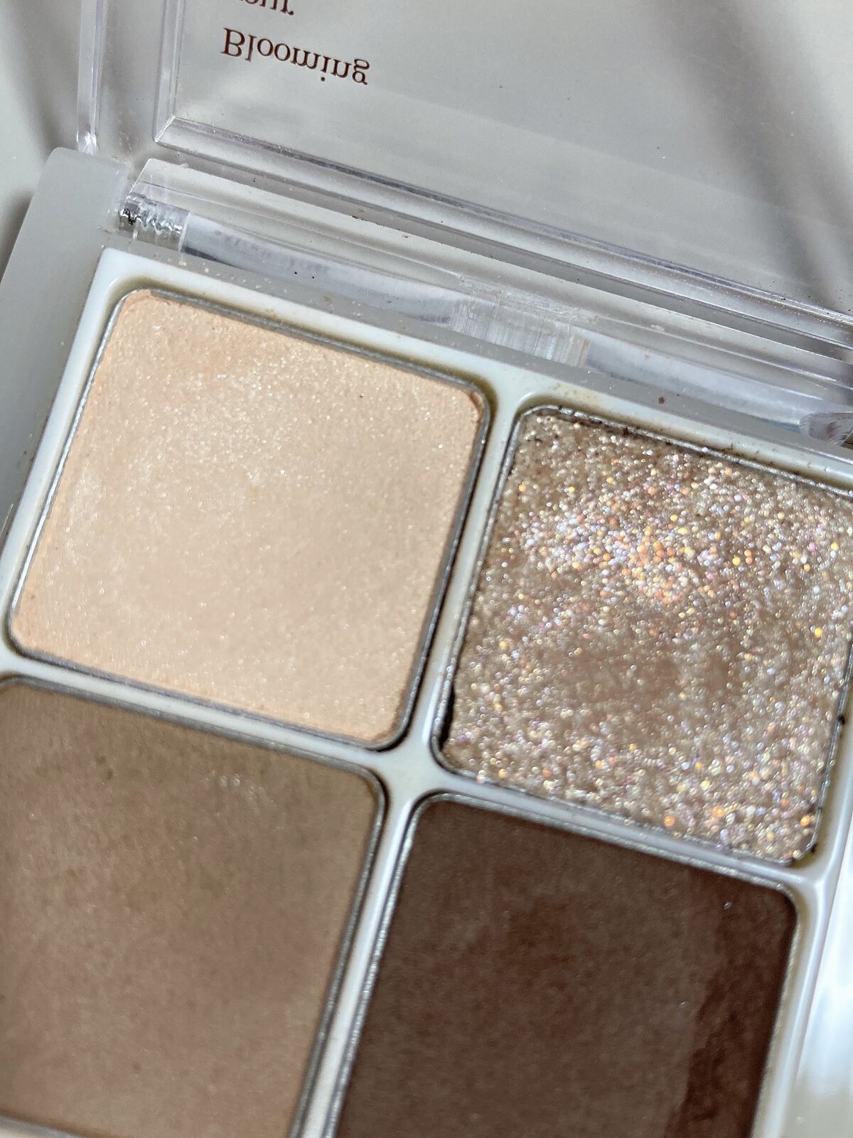 上のクリームベースは目元を自然に明るくします❗️ クリームですが塗るとサラサラでベタつきはありません⸜( •⌄• )⸝ 次に左下のベージュブラウンですが、淡い発色なのに何故か仕上がると立体感がでてくる絶妙な発色です✺ そこで右下のラメカラーの登場です( ¯꒳¯ )b✧ こちらを塗ることで一気に明るさと透明感のあるベージュブラウン(少しオレンジがかっている)に仕上がります٩꒰。•◡•。꒱۶’ ラメを多めにつけると、キラキラとして透明感のある華やかな印象に仕上げてくれるのでこれからの季節にもおすすめですଘ(੭*ˊᵕˋ)੭* ੈ♡‧₊˚