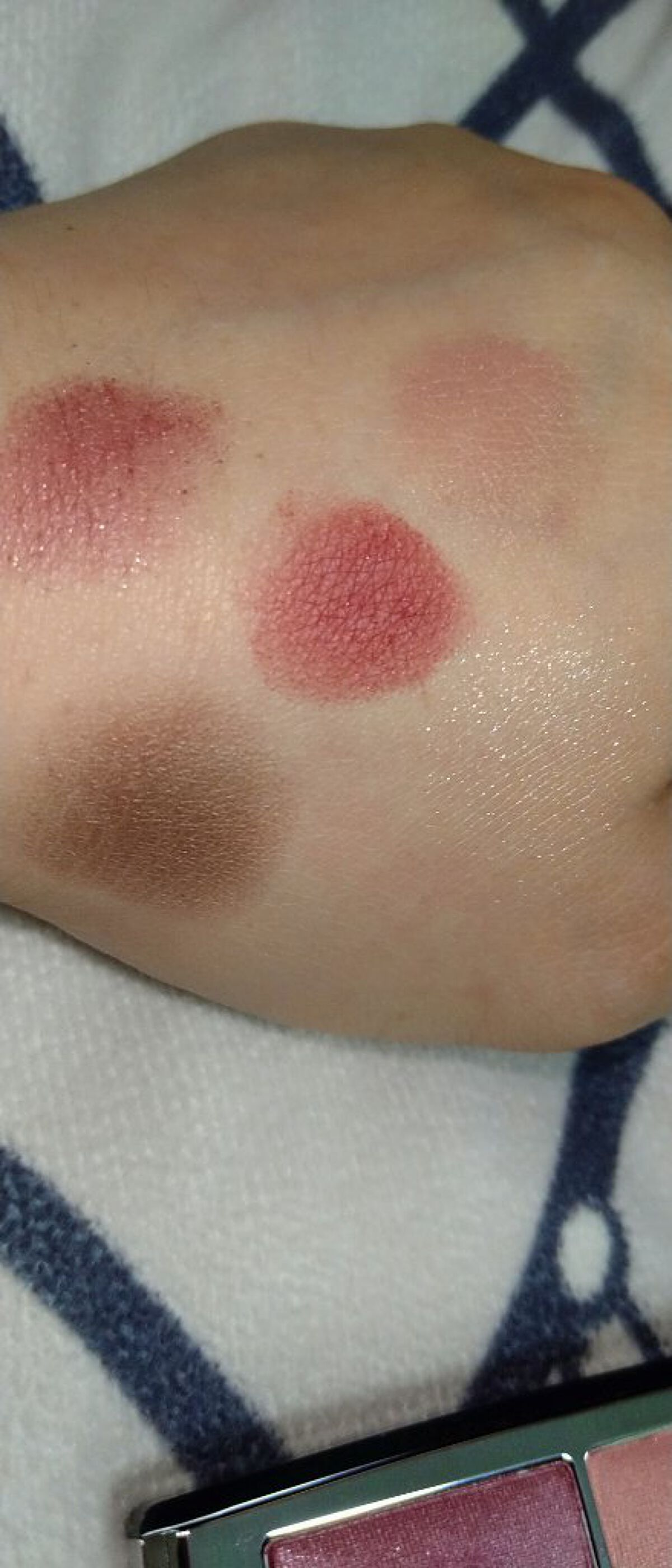 【使った商品】SUQQUシグニチャーカラーアイズ127:褐砂-KASSA<限定色>【色味】左上:ブルーグレー左下:ルビーレッド右上:ピンクベージュ右下:赤みブラウン【密着感】かなり◎【発色】かなり◎【良いところ】ラメがすごくいい粉質が最高よれ...