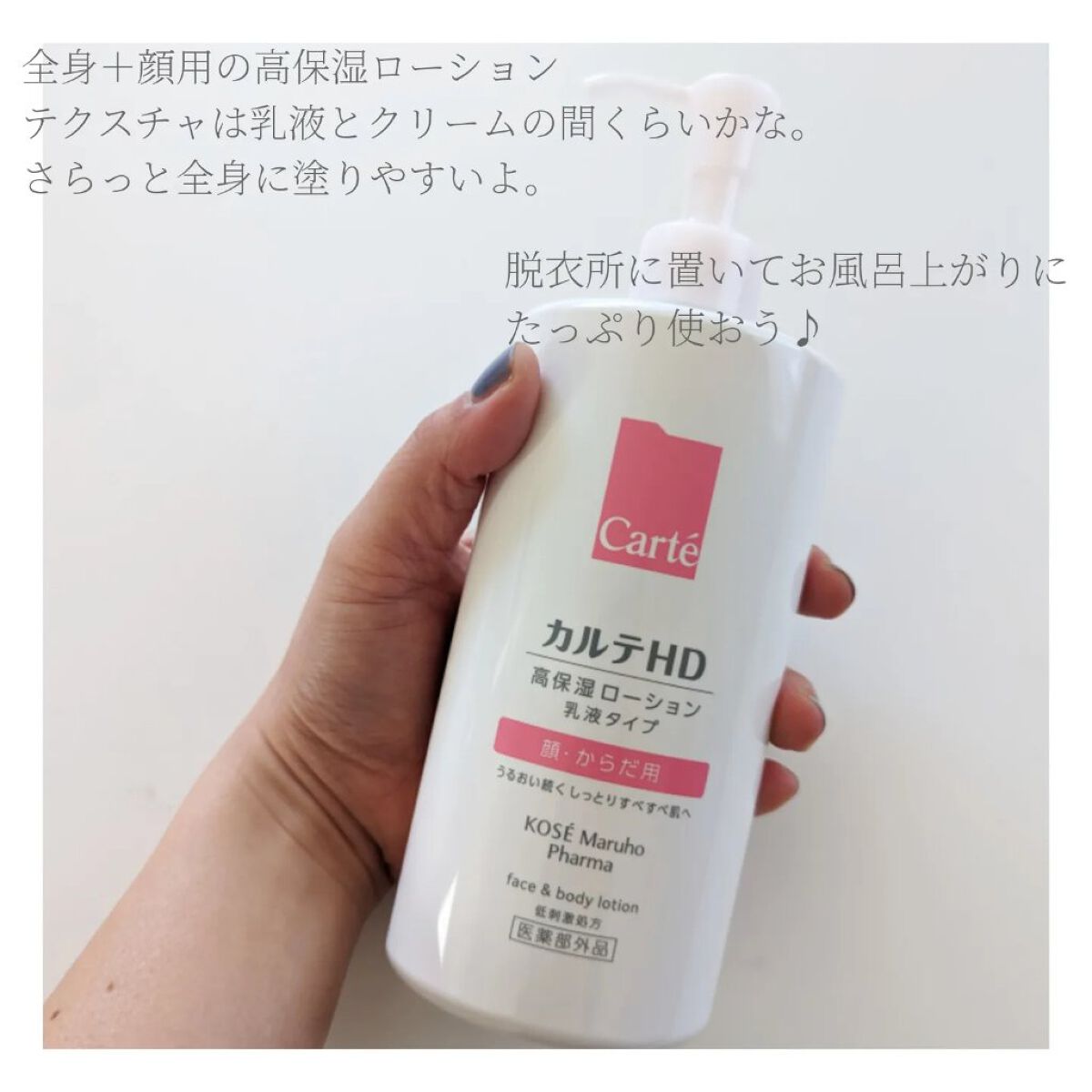- 【高保湿フェイス&ボディローション】 顔にもからだにも。しっとりやわらか肌つづく。 信頼の保水有効成分「ヘパリン類似物質HD※」配合、低刺激処方の高機能フェイス&ボディローションです。 ヘパリン類似物質HDが、気温・湿度の変化で乾燥しやすいからだの肌のうるおい構造(角層ラメラ)を立て直し、しっとりやわらか肌に導きます。 2種のこだわりオイル配合で、しっとりするのにべたつかず、なめらかにのびひろがる使用感。敏感な肌でもまさつによるストレスがなく、全身をうるおいで満たします。 カルテHDシリーズとしては初めてお子さま(3歳以上)にもお使いいただける商品。 ・ボトルタイプ(220mL) ・ポンプタイプ(410mL) ・つめかえ用(370mL)の3種でラインアップ。 ご自身の保湿に、ご家族や大切なかたの保湿に。みずみずしくなめらかなうるおいが全身を包み込むフェイス&ボディローションです。 ※保水有効成分ヘパリン類似物質のこと <販売名:HD フェイスボディL>
