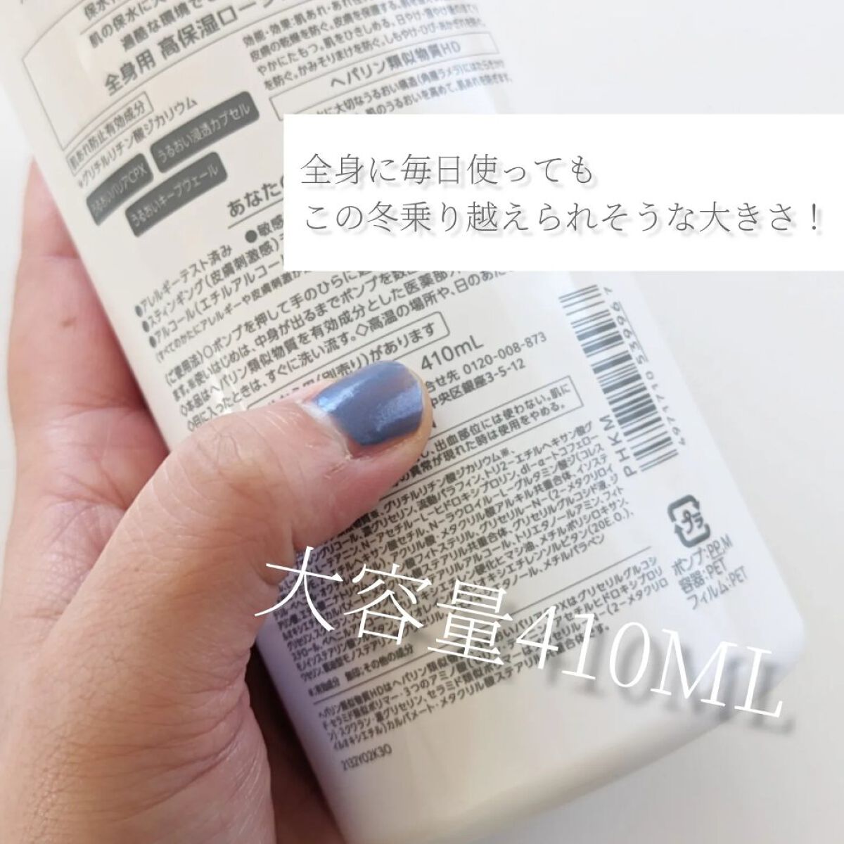 - <ボトルタイプ(220mL)> 有効成分 ヘパリン類似物質、グリチルリチン酸ジカリウム その他の成分 精製水、1,3-ブチレングリコール、濃グリセリン、流動パラフィン、トリ2-エチルヘキサン酸グリセリル、L-セリン、L-テアニン、N-アセチル-L-ヒドロキシプロリン、dl-α-トコフェロール、天然ビタミンE、2-エチルヘキサン酸セチル、N-ラウロイル-L-グルタミン酸ジ(コレステリル・ベヘニル・オクチルドデシル)、アクリル酸・メタクリル酸アルキル共重合体、イソステアリン酸、エデト酸二ナトリウム、オレイン酸フィトステリル、グリセリル-N-(2-メタクリロイルオキシエチル)カルバメート・メタクリル酸ステアリル共重合体、グリセリルグルコシド液、ジグリセリン、スクワラン、ステアリン酸、セトステアリルアルコール、トリエタノールアミン、フィトステロール、ベヘニルアルコール、ポリオキシエチレン硬化ヒマシ油、メチルポリシロキサン、モノイソステアリン酸ソルビタン、モノオレイン酸ポリオキシエチレンソルビタン(20E.O.)、ワセリン、親油型モノステアリン酸グリセリル、フェノキシエタノール、メチルパラベン <ポンプタイプ(410mL)> 有効成分 ヘパリン類似物質、グリチルリチン酸ジカリウム その他の成分 精製水、1,3-ブチレングリコール、濃グリセリン、流動パラフィン、トリ2-エチルヘキサン酸グリセリル、L-セリン、L-テアニン、N-アセチル-L-ヒドロキシプロリン、dl-α-トコフェロール、天然ビタミンE、2-エチルヘキサン酸セチル、N-ラウロイル-L-グルタミン酸ジ(コレステリル・ベヘニル・オクチルドデシル)、アクリル酸・メタクリル酸アルキル共重合体、イソステアリン酸、エデト酸二ナトリウム、オレイン酸フィトステリル、グリセリル-N-(2-メタクリロイルオキシエチル)カルバメート・メタクリル酸ステアリル共重合体、グリセリルグルコシド液、ジグリセリン、スクワラン、ステアリン酸、セトステアリルアルコール、トリエタノールアミン、フィトステロール、ベヘニルアルコール、ポリオキシエチレン硬化ヒマシ油、メチルポリシロキサン、モノイソステアリン酸ソルビタン、モノオレイン酸ポリオキシエチレンソルビタン(20E.O.)、ワセリン、親油型モノステアリン酸グリセリル、フェノキシエタノール、メチルパラベン <つめかえ用(370mL)> 有効成分 ヘパリン類似物質、グリチルリチン酸ジカリウム その他の成分 精製水、1,3-ブチレングリコール、濃グリセリン、流動パラフィン、トリ2-エチルヘキサン酸グリセリル、L-セリン、L-テアニン、N-アセチル-L-ヒドロキシプロリン、dl-α-トコフェロール、天然ビタミンE、2-エチルヘキサン酸セチル、N-ラウロイル-L-グルタミン酸ジ(コレステリル・ベヘニル・オクチルドデシル)、アクリル酸・メタクリル酸アルキル共重合体、イソステアリン酸、エデト酸二ナトリウム、オレイン酸フィトステリル、グリセリル-N-(2-メタクリロイルオキシエチル)カルバメート・メタクリル酸ステアリル共重合体、グリセリルグルコシド液、ジグリセリン、スクワラン、ステアリン酸、セトステアリルアルコール、トリエタノールアミン、フィトステロール、ベヘニルアルコール、ポリオキシエチレン硬化ヒマシ油、メチルポリシロキサン、モノイソステアリン酸ソルビタン、モノオレイン酸ポリオキシエチレンソルビタン(20E.O.)、ワセリン、親油型モノステアリン酸グリセリル、フェノキシエタノール、メチルパラベン
