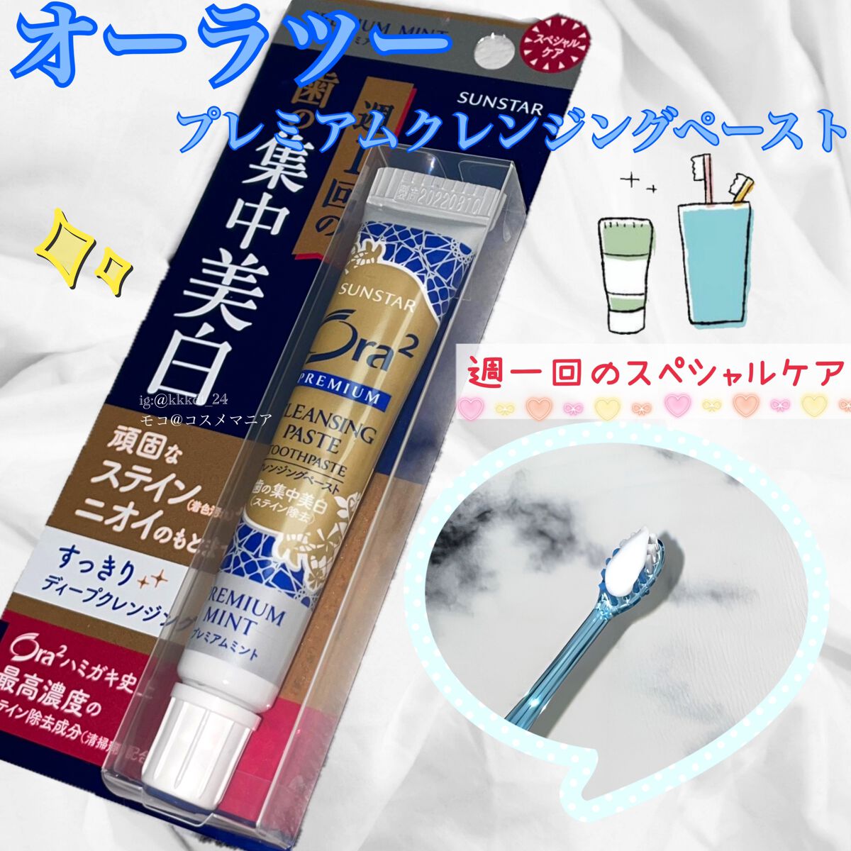 週1回、通常の歯みがきをするように使うだけ。 頑固なステインやニオイのもとをすっきりディープクレンジングします。 オーラツーハミガキ史上最高濃度のステイン除去成分(清掃剤)配合で、白くつややかでツルツルの歯になります。 とてもなめらかなペーストでざらつきなども無く、 とても心地良い使用感◎