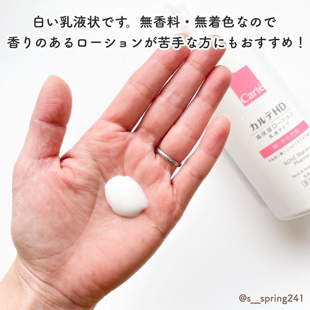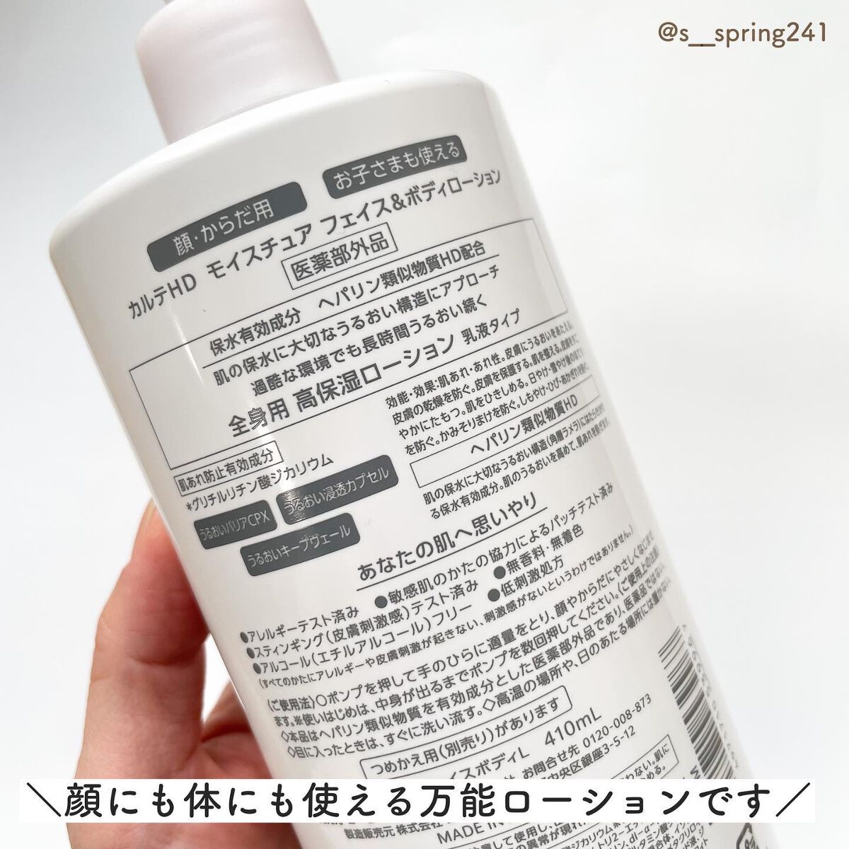 - 【高保湿フェイス&ボディローション】 顔にもからだにも。しっとりやわらか肌つづく。 信頼の保水有効成分「ヘパリン類似物質HD※」配合、低刺激処方の高機能フェイス&ボディローションです。 ヘパリン類似物質HDが、気温・湿度の変化で乾燥しやすいからだの肌のうるおい構造(角層ラメラ)を立て直し、しっとりやわらか肌に導きます。 2種のこだわりオイル配合で、しっとりするのにべたつかず、なめらかにのびひろがる使用感。敏感な肌でもまさつによるストレスがなく、全身をうるおいで満たします。 カルテHDシリーズとしては初めてお子さま(3歳以上)にもお使いいただける商品。 ・ボトルタイプ(220mL) ・ポンプタイプ(410mL) ・つめかえ用(370mL)の3種でラインアップ。 ご自身の保湿に、ご家族や大切なかたの保湿に。みずみずしくなめらかなうるおいが全身を包み込むフェイス&ボディローションです。 ※保水有効成分ヘパリン類似物質のこと <販売名:HD フェイスボディL>