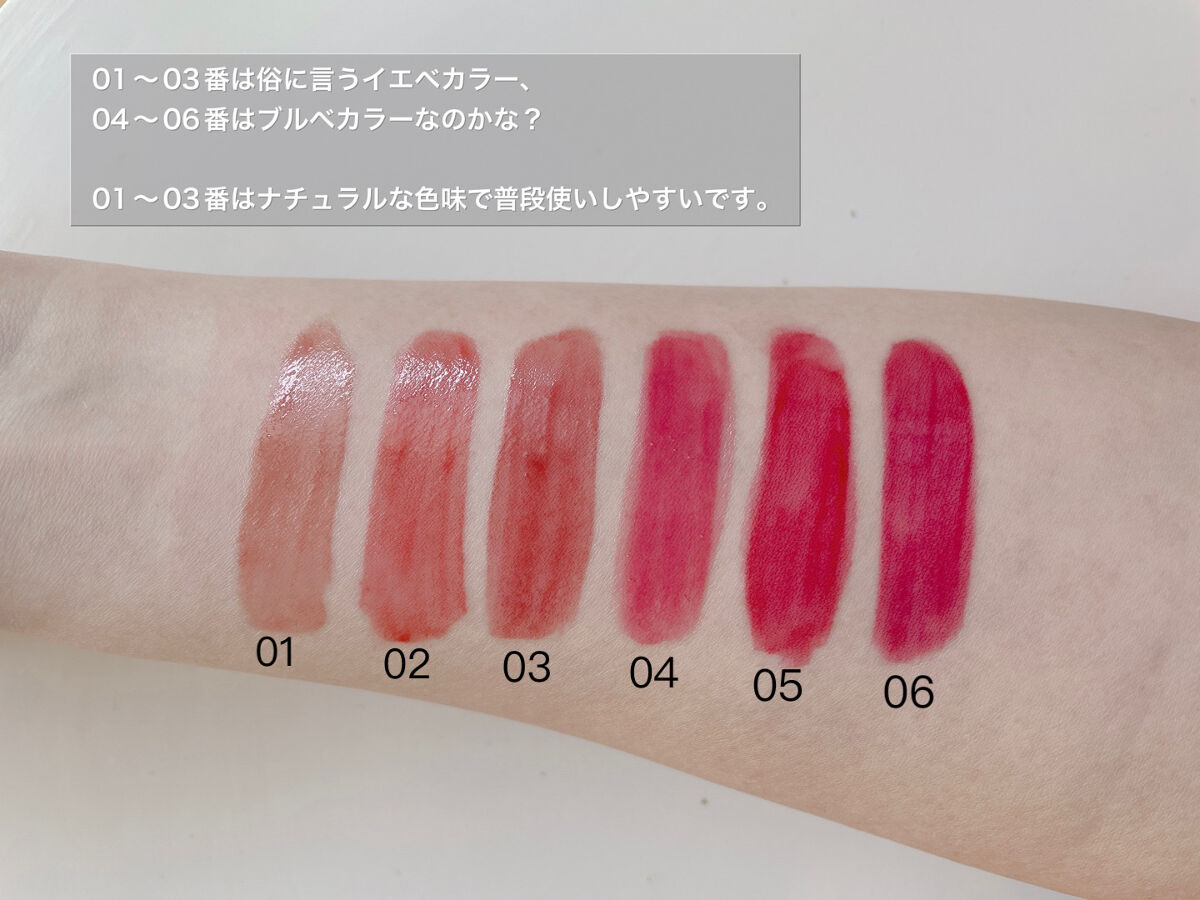 - <01 BEST BEIGE MENU(推し杏子ベージュ)> 水、ジフェニルジメチコン、リンゴ酸ジイソステアリル、ビスジグリセリルボリアシルアジペート-2、水添ポリイソブテン、ダイマー ジリノール酸ダイマージリノレイルビス(ベヘニル/イソステアリル/フィトステリル)、ジグリセリン、セチルPEG/PPG-10/1ジメチコン、DPG、水添ポリ (C6-14 オレフィン)、ポリソルベート60、イソステアリン酸ソルビタン、ダイマージリノール酸ジイソステアリン酸ポリ グリセリル-3、ペンチレングリコール、(アクリル酸ヒドロキシエチル/アクリロイルジメチルタウリンNa)コポリマー、トリ(カプリル酸/ カプリン酸)グリセリル、スクワラン、セテアレス-20、(エチレン/プロピレン)コポリマー、フェノキシエタノール、グリセリン、ポリグリ セリン-3、香料、エチルヘキシルグリセリン、ハマメリス葉エキス、オニユリエキス、BG、酸化チタン、黄5、赤227、赤104(1)、青1 <02 CORAL INFLUENCER(イエベ必須コーラル)> 水、ジフェニルジメチコン、リンゴ酸ジイソステアリル、ビスジグリセリルボリアシルアジペート-2、水添ポリイソブテン、ダイマー ジリノール酸ダイマージリノレイルビス(ベヘニル/イソステアリル/フィトステリル)、ジグリセリン、セチルPEG/PPG-10/1ジメチコン、DPG、水添ポリ (C6-14 オレフィン)、ポリソルベート60、イソステアリン酸ソルビタン、ダイマージリノール酸ジイソステアリン酸ポリ グリセリル-3、ペンチレングリコール、(アクリル酸ヒドロキシエチル/アクリロイルジメチルタウリンNa)コポリマー、トリ(カプリル酸/ カプリン酸)グリセリル、スクワラン、セテアレス-20、(エチレン/プロピレン)コポリマー、フェノキシエタノール、グリセリン、ポリグリ セリン-3、香料、エチルヘキシルグリセリン、ハマメリス葉エキス、オニユリエキス、BG、酸化チタン、黄5、赤227、赤104(1)、青1 <03 ROSE IN MIND(いいねローズ)> 水、ジフェニルジメチコン、リンゴ酸ジイソステアリル、ビスジグリセリルポリアシルアジペート-2、水添ポリイソブテン、ダイマージリノール酸ダイマージリノレイルビス(ベヘニル/イソステアリル/フィトステリル)、ジグリセリン、DPG、セチルPEG/PPG-10/1ジメチコン、水添ポリデセン、ポリソルベート60、イソステアリン酸ソルビタン、ダイマージリノール酸ジイソステアリン酸ポリグリセリル-3、ペンチレングリコール、(アクリル酸ヒドロキシエチル/アクリロイルジメチルタウリンNa)コポリマー、トリ(カプリル酸/カプリン酸)グリセリル、スクワラン、セテアレス-20、(エチレン/プロピレン)コポリマー、フェノキシエタノール、グリセリン、香料、エチルヘキシルグリセリン、ハマメリス葉エキス、オニユリエキス、BG、テトラ(ジ-t-ブチルヒドロキシヒドロケイヒ酸)ペンタエリスリチル、酸化チタン、黄5、赤104(1)、赤227、青1 <04 PINK YOUTH(ベイビー天使)> 水、ジフェニルジメチコン、リンゴ酸ジイソステアリル、ビスジグリセリルボリアシルアジペート-2、水添ポリイソブテン、ダイマー ジリノール酸ダイマージリノレイルビス(ベヘニル/イソステアリル/フィトステリル)、ジグリセリン、セチルPEG/PPG-10/1ジメチコン、DPG、水添ポリ (C6-14オレフィン)、ポリソルベート60、イソステアリン酸ソルビタン、ダイマージリノール酸ジイソステアリン酸ポリ グリセリル-3、ペンチレングリコール、(アクリル酸ヒドロキシエチル/アクリロイルジメチルタウリンNa)コポリマー、トリ(カプリル酸/ カプリン酸)グリセリル、スクワラン、セテアレス-20、(エチレン/プロピレン)コポリマー、フェノキシエタノール、ポリグリセリン-3、香料、エチルヘキシルグリセリン、グリセリン、水酸化Al、ポリアクリル酸アンモニウム、BG、ハマメリス葉エキス、オニユリエキス、酸化チタン、赤227、黄4、赤104 (1) 黄5、青1 <05 CHERRY SO WHAT(どうしたのチェリー)> 水、ジフェニルジメチコン、リンゴ酸ジイソステアリル、ビスジグリセリルポリアシルアジペート-2、水添ポリイソブテン、ダイマージリノール酸ダイマージリノレイルビス(ベヘニル/イソステアリル/フィトステリル)、ジグリセリン、セチルPEG/PPG-10/1ジメチコン、DPG、水添ポリ(C6-14オレフィン)、ポリソルベート60、イソステアリン酸ソルビタン、ダイマージリノール酸ジイソステアリン酸ポリグリセリル-3、ペンチレングリコール、(アクリル酸ヒドロキシエチル/アクリロイルジメチルタウリンNa)コポリマー、トリ(カプリル酸/カプリン酸)グリセリル、スクワラン、セテアレス-20、(エチレン/プロピレン)コポリマー、フェノキシエタノール、ポリグリセリン-3、香料、エチルヘキシルグリセリン、グリセリン、ハマメリス葉エキス、オニユリエキス、BG、赤227、黄4、赤104(1)、黄5、青1 <06 PLUM UPDATE(プロフ写プラム)> 水、ジフェニルジメチコン、リンゴ酸ジイソステアリル、ビスジグリセリルポリアシルアジペート-2、水添ポリイソブテン、ダイマー ジリノール酸ダイマージリノレイルビス(ベヘニル/イソステアリル/フィトステリル)、