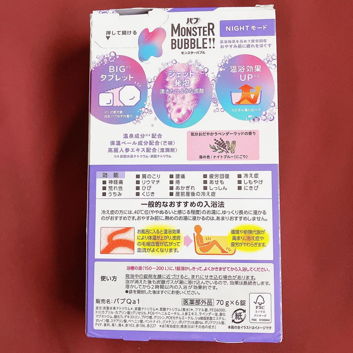 バブモンスターバブル NIGHTモードジュワっと回復!強炭酸チャージ**勢いよく発泡しながら、炭酸がお湯に溶け込むこと時々ひとりでお風呂タイムを楽しんでいます💕そんなときに欠かせないのは入浴剤✨今回使ってみたバブモンスターバブル NIGHTモ...