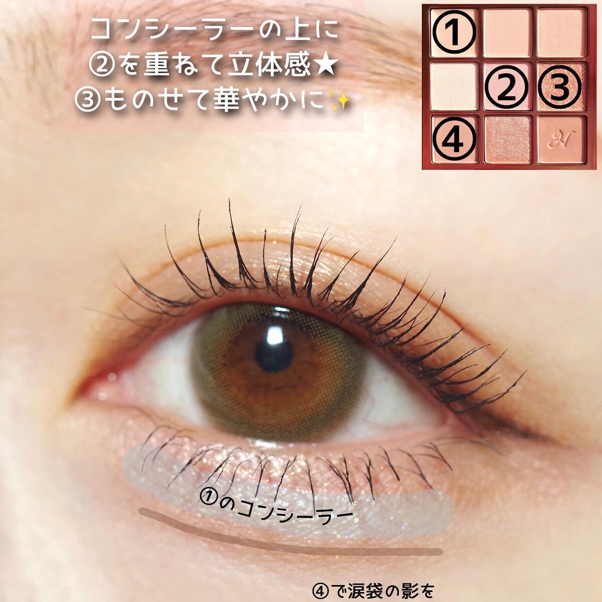 - 涙袋用コンシーラー入りの9色アイシャドウパレット。涙袋用コンシーラーや涙袋の影カラー、涙袋を立体的にみせるハイピグメントのラメやハイライターが入った9色パレットです。これ1つで様々なニュアンスの「涙袋メイク」や「下まぶたメイク」を楽しめます。