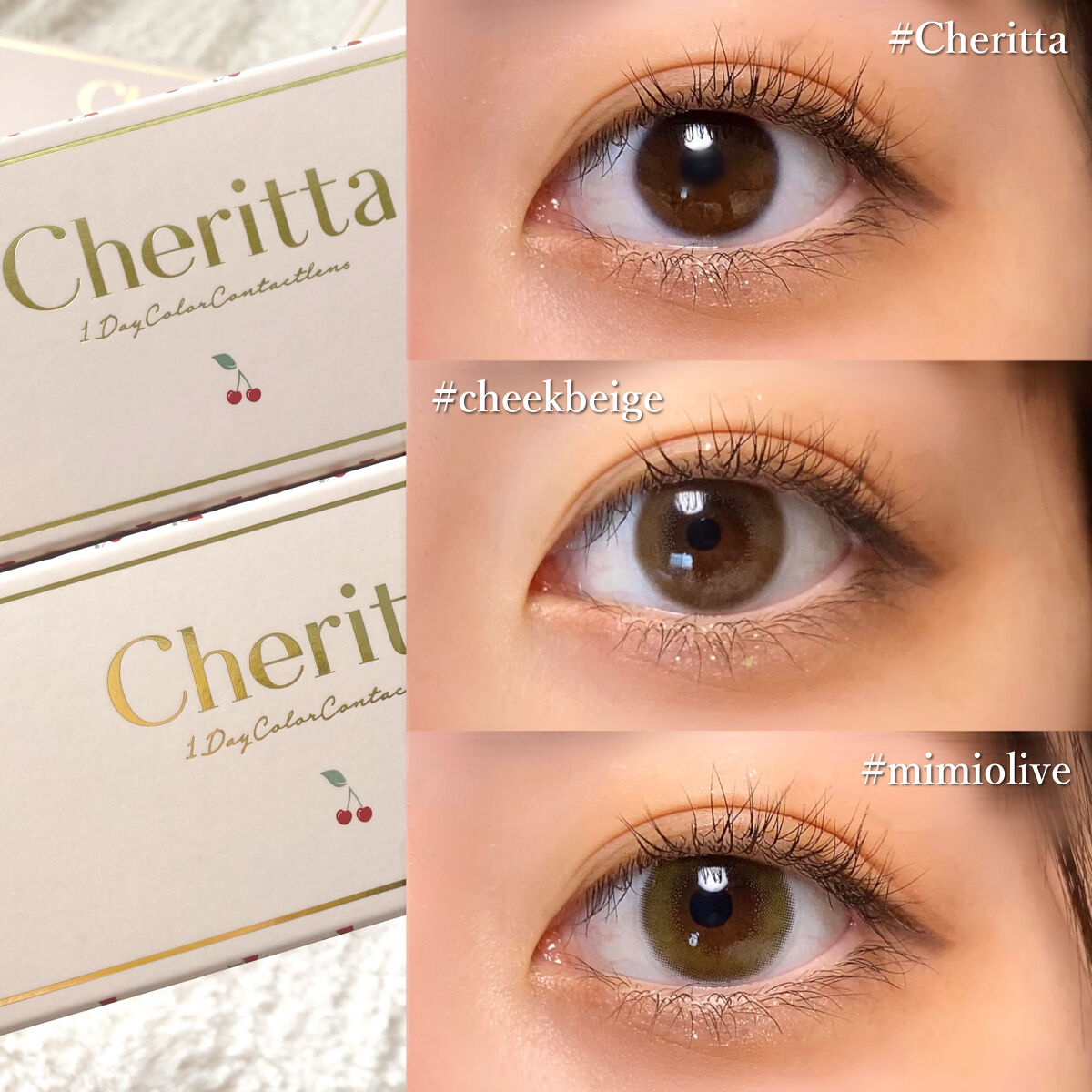 - “仕込む”ナチュラルメイク。 もっと自然に可愛くなりたい、そんなすべての女性へ。 Cheritta(チェリッタ)は、「イメチェンしたいけど変わりすぎるのは苦手」「ちょっとだけあか抜けたい」という全ての女性へ向け、メイクの過程にチェリッタを加えるだけで、いつもより自然に可愛くなれるナチュラルなデザインのカラーコンタクトレンズブランドです。 カラーコンタクトレンズの不適正使用による眼障害の危険性等などがあります。 ●コンタクトレンズは高度管理医療機器です。不十分な洗浄・消毒など不適切なケアや、長時間・交換期間を超えた装用により、アレルギー性結膜炎、角膜感染症、角膜潰瘍等の重篤な眼障害が発生する危険性があります ●ご使用前に取扱説明書を確認してください 使用上の留意事項 ●眼科医院等を受診してからお求めください ●眼に異常を感じたら直ちにレンズ使用を中止し、お近くの眼科等で診察を受けてください ●医師の指示にしたがってご使用ください ●コンタクトレンズを装用する場合、自覚症状がなくても、眼科医院等での定期検査を受けてください ●レンズに不具合がある場合は使用しないでください