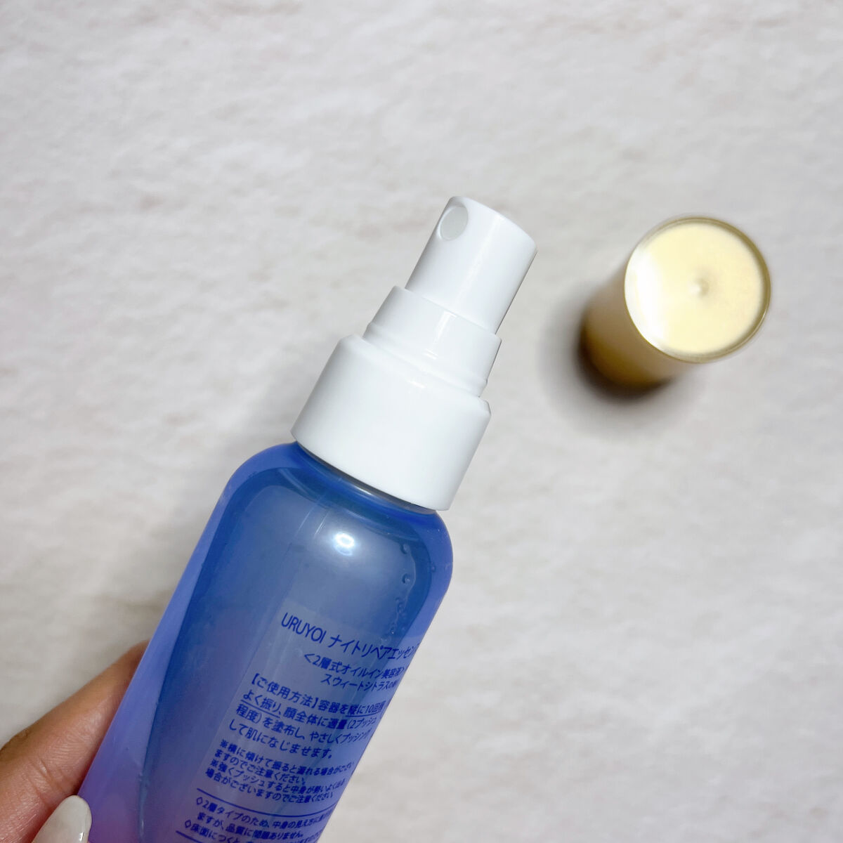 2層式のオイル&美容液ミストで、振って混ぜて使います。 モイストはスウィートシトラスの香り バランスはフォレストシトラスの香り 肌の状態に合わせて選べる2タイプ。 カサカサしてごわつくお肌にモイスト。 ベタつくのにカサつくお肌にバランス。 乾燥、摩擦など睡眠中の肌ストレスから保護し、翌朝つややかな素肌に導きます。 URUYOIつけたら寝るというルーティンができるのでおすすめです。 モイストのスウィートシトラスの香りが特に好きです。 さらに、バランスのフォレストシトラスの香りを追加するとまた違った香りになるので、組み合わせても良い香りがします。 顔、ボディ、そしてヘアにも使えるので、好きな部分に付けられるのも良いです。
