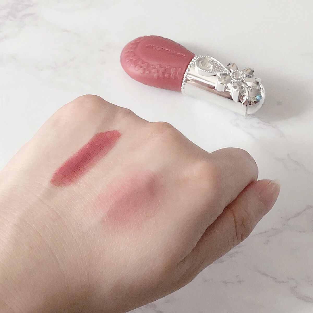 花から零れ落ちる涙をイメージして作られたデザインのリップ&チーク🫧 ボトルのデザインも、ほわっと儚げな質感と色味も、すべてに可愛さが詰め込まれてます🥰 ほんとに少量で済むので、1年ほど愛用してますがまだ無くなりません🥹コスパ最強…!! リキッドタイプだしヨレにくいので最後まで色味を保ってくれます👏🏻
