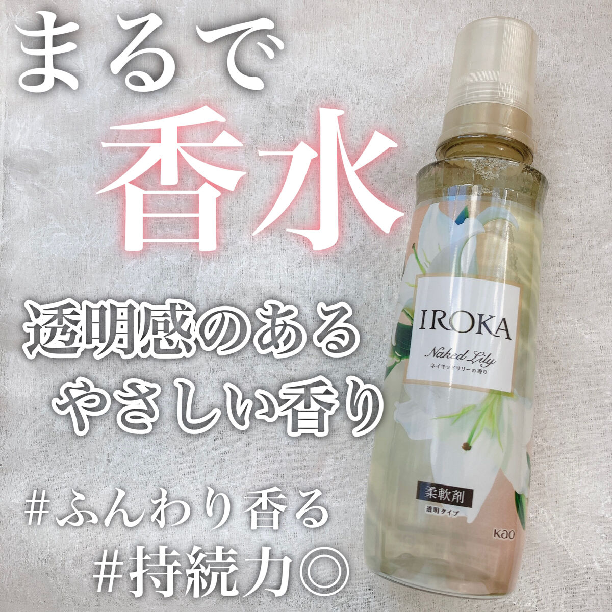 - 香水のように香り高い プレミアム柔軟剤IROKA。 素肌のあたたかさを想わせる「ピュアムスク*1」と、香水には欠かせない「高級アンバー」を贅沢*2に使用。 香水のように上質、なのに透明感あふれるその香りは、あなたらしい美しさを、上品にさりげなく引き立てる。 透明感あふれる上品な「ネイキッドリリー」の香り。 *1天然ムスク香気の主成分と同構造のl-Muscone *2当社柔軟剤比