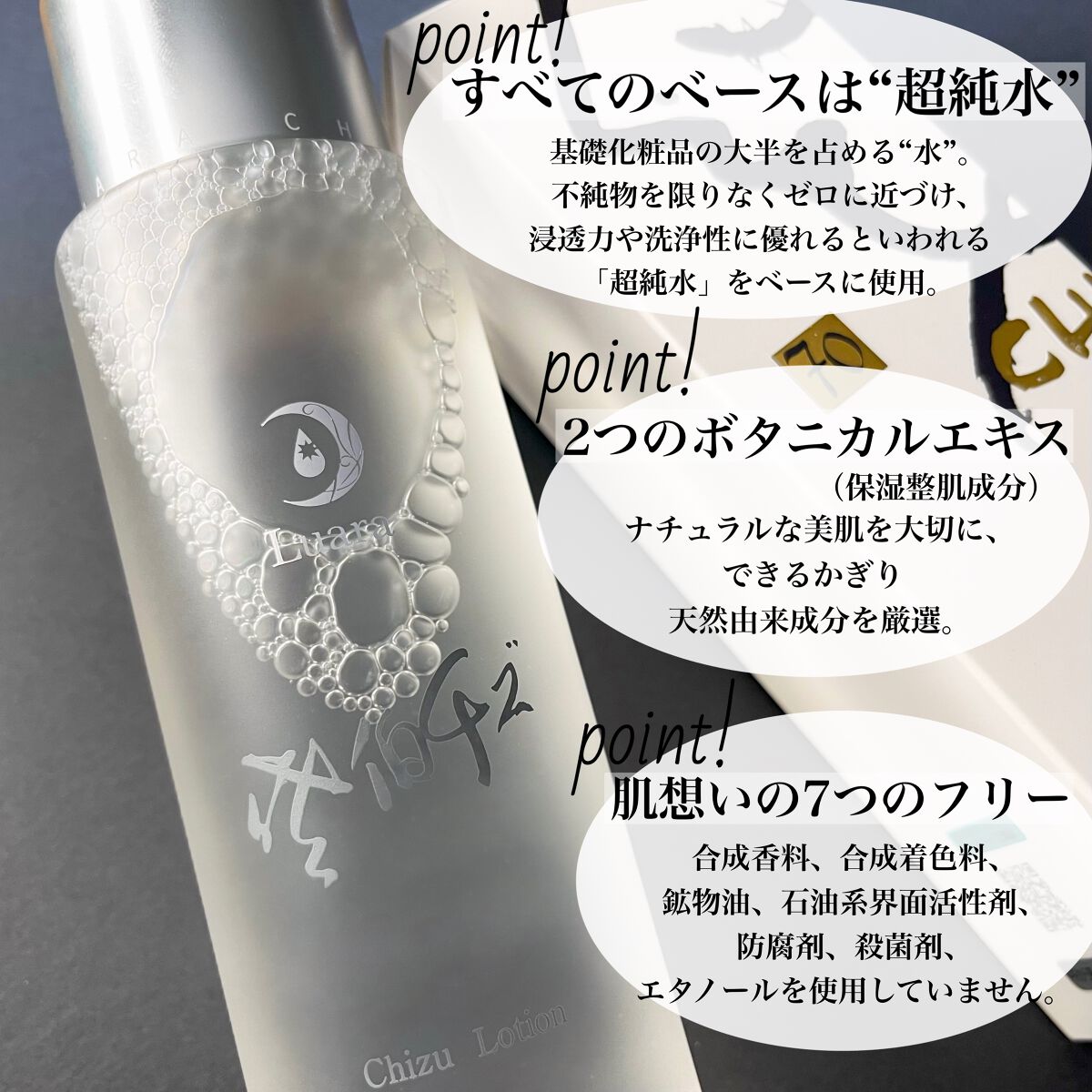 - 美容家の佐伯チズ氏監修。不純物を限りなくゼロに近づけ、浸透力*1や洗浄性に優れると言われる超純水をベースに、肌に健やかな潤いを与える、米由来の植物セラミド*2を配合した保湿ローション。2つのボタニカル成分レモングラス*2(レモングラス葉/茎エキス)、カミツレ(カミツレ花エキス)*2など、可能な限り自然由来の潤い美容成分にこだわりました。合成香料、合成着色料、鉱物油、石油系界面活性剤、防腐剤、殺菌剤、エタノール不使用。 *1角層まで *2保湿成分
