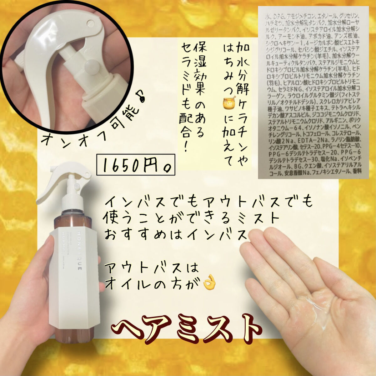 髪の芯から鍛える*ハニープロテイン処方.ᐟ.ᐟ ✓オーガニックマヌカハニー*1配合 →髪内部の保水力をアップ シャンプーは少しとろみがあってきめ細かい泡で泡立ちが良い🫧 洗い上がりはきしんだりしなくて◎ 仕上がりは乾燥の季節だからか重たくなくしっとりするけどサラッとした感じ.ᐟ.ᐟ 毛先がチクチクしにくく指通り◎