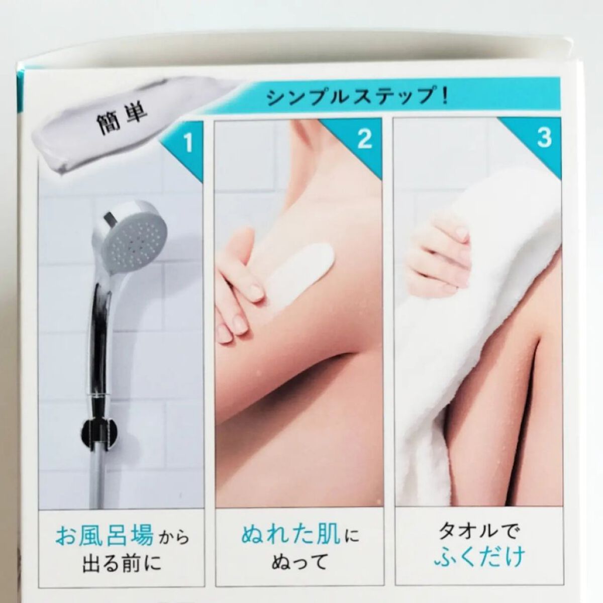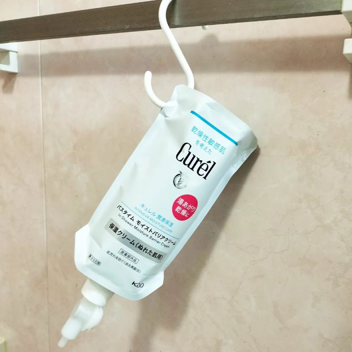 つりさげるタイプなので お風呂を出る前に立ったまま使えるのが楽! 下部のスイッチは軽い力で液の量が調節できて便利👌 逆流しない構造になっているから、 水や空気が中に入りこまず、 最後まで使いきれるんだって◎ ぬれた肌にのせると、 クリームが水分となじんで、 ローション状に変化するから 全身にするする伸ばせます🙌 ベタつかずしっとりするような使い心地で、 もちろん洗い流しも不要♪ お風呂場を出る前に一気に スキンケアができるから、 スキンケアがついつい後回しに なっちゃう私にもぴったり😆