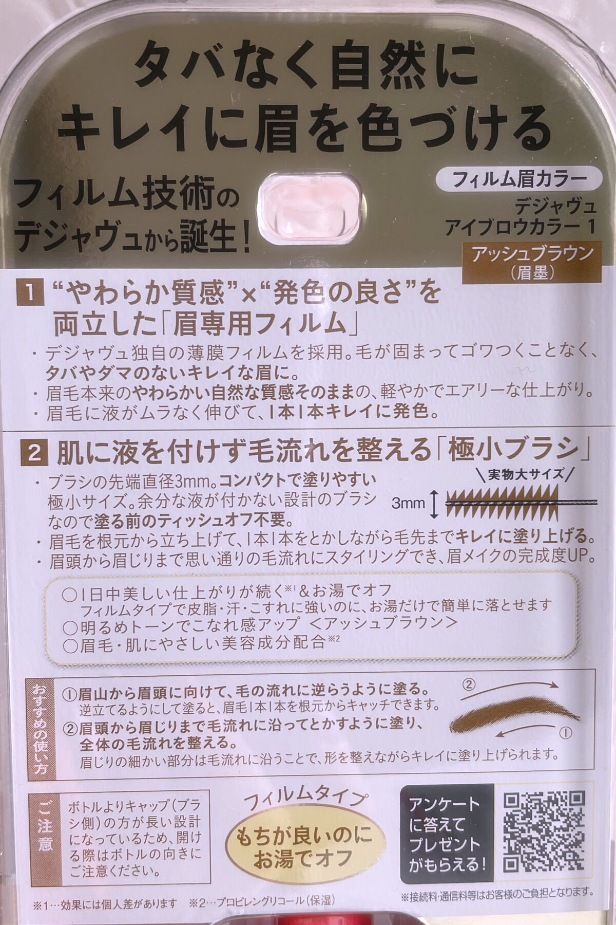 1本1本色づき固まらない「フィルム眉カラー」 塗りやすい極小ブラシで簡単垢抜け✨ デジャヴュ独自の薄膜フィルムを採用。 毛がパリッと固まらず、タバやダマのないふんわり自然な眉に。 フィルムタイプで速乾性が高く、皮脂・汗・こすれに強いのに、お湯だけで簡単に落とせます✨