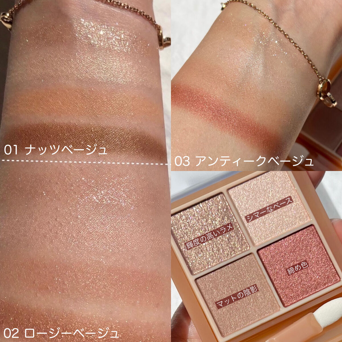 左上のラメもプチプラとは思えないくらい綺麗✨ 01ナッツベージュは少しオレンジっぽいベージュだから、イエベカラーが苦手な方は別のカラーをお勧めします💓 粉質もすごくよくて、粉飛びしないしちょうどいい😻🌟