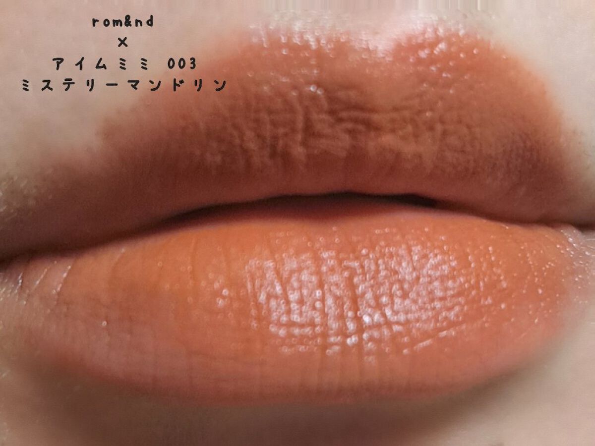 マットタイプでオレンジ系のティントが欲しくて マット質感ブラーティント 03ミステリーマンダリン 手に塗ってみて、3色の中では落ち着いていて、唇に重ね塗りもかわいいけど、イエベの方に馴染みやすくて落ち着いていたオレンジ。 08ミステリーキャラメル(カラメル) 「03ミステリーマンダリン」と似た感じがしましたが、「08ミステリーキャラメル」の方が暗いですね。 09ミステリーパーシモン 写真では赤に見えますが、、 手に塗ってみると、3色の中で濃く、レンガ色に見えました。 3色ともほぼ同じ系統ではありましたが、微妙に色の違いはありました。 マットなので少々縦じわがありますが、唇が乾燥する感じは私はありませんでした。 アイムミミのコスメは初めて購入しましたが、お気に入りのリップが増えました