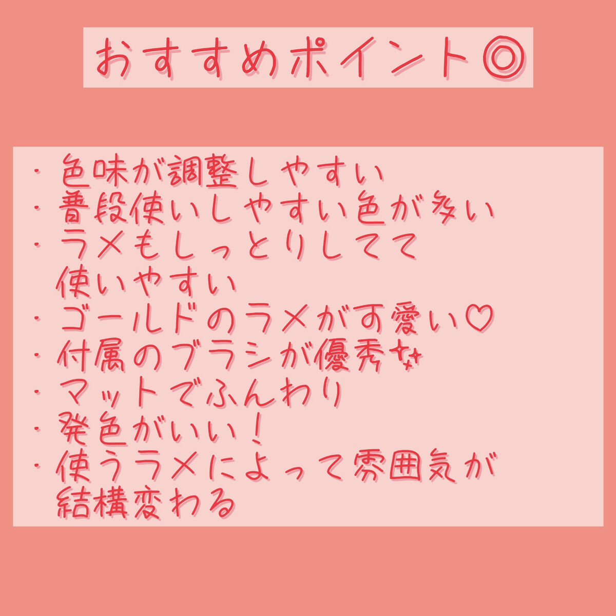 使うラメによって雰囲気が一気に変わるので、1つで簡単に色んなメイクができてオススメです! 色味が調整しやすいラメはサラサラしているのにピタッと密着ゴールドのラメが可愛い♡マットでふんわり発色がいい斜めカットの筆があるのでアイラインも引ける △しっぽの白い部のラメがすぐなくなる︎☝︎ラメは指でやるとかわいい♡
