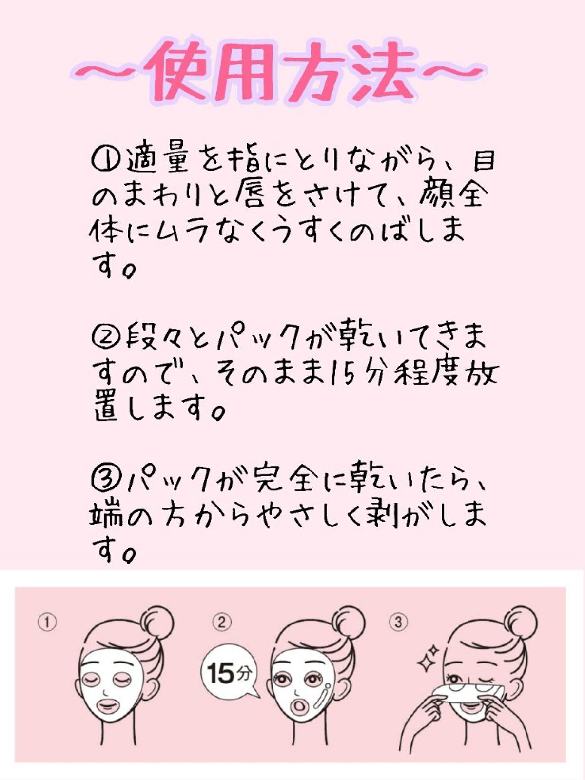 - 肌の上で乾かしてはがすタイプのパックで古い角質や汚れをオフします。 潤いラッピング効果でパック後はしっとりツヤ肌に。つるつるとうるおいの両方を叶えます。 配合成分:たっぷりの桃果汁配合 なめらか肌に導くジューシーな桃果汁をシリーズ最高濃度で配合。 使用方法 ①洗顔後、軽く水気をふき取った肌にご使用ください。 ②適量を指にとりながら、目のまわりと唇をさけ、顔全体にムラなくうすく伸ばします。 ③徐々にパックが乾いてくるので、そのまま15分程度放置します。パックが肌に残った場合は、水かぬるま湯で洗い流します。