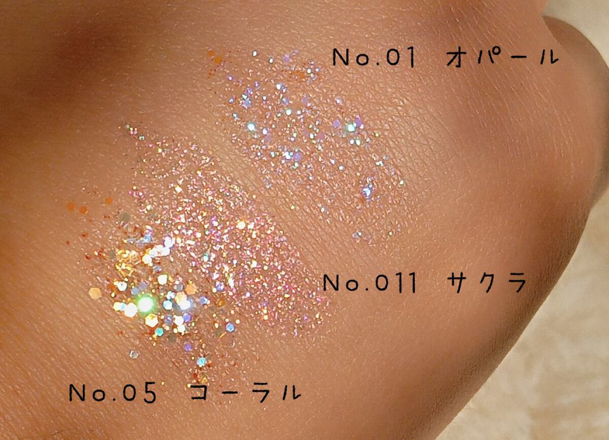 真っ白な雪原にガラス粉を蒔いたように妙に輝くオパール No.01 オパール 華麗に打ち上げられる花火のように輝くコーラル No.05 コーラル 暖かい日差しの下で舞い散る桜のように輝くサクラ No.11 サクラ このグリッターほんとに可愛い! 質感が初めての質感で、プルプルで使ってて楽しくなるグリッター! 値段も490円だし初めてグリッター使う方も使いやすいと思う!