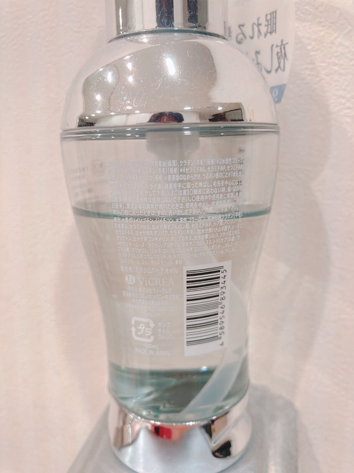 - <100ml> 水添ポリイソブテン、ジメチコン、水溶性コラーゲン、加水分解ケラチン(羊毛)、月見草油、セラミドNG、加水分解ヒアルロン酸、セラミドNP、シア脂、パンテノール、セラミドAP、加水分解乳タンパク、ケラチン(羊毛)、加水分解ハトムギ種子、γ-ドコサラクトン、加水分解コンキオリン、ホップエキス、加水分解シルク、ソケイ花エキス、メドウフォーム-δ-ラクトン、グリセリン、クオタニウム-33、トリ(カプリル酸/カプリン酸)グリセリル、(ジメチコン/ビニルジメチコン)クロスポリマー、オレス-2、ジステアリルジモニウムクロリド、水、トコフェロール、イソプロパノール、PG、BG、コレステロール、フェノキシエタノール、香料