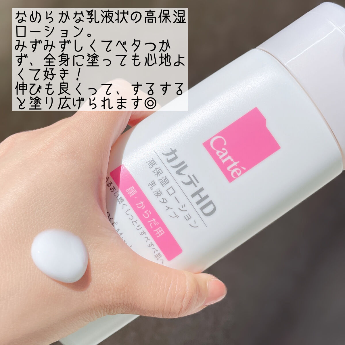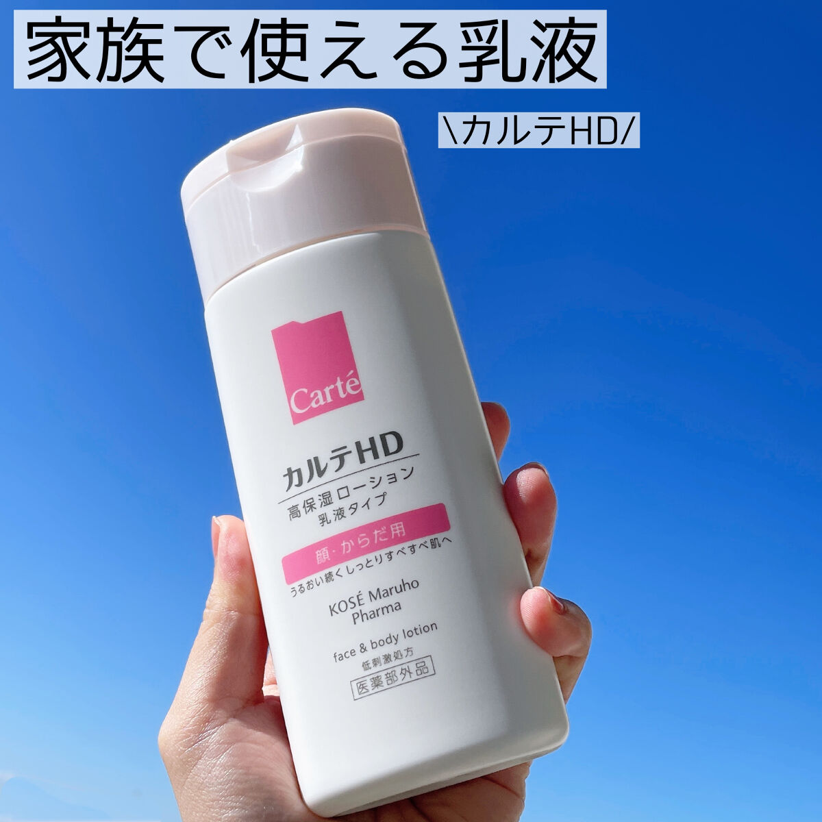 - 【高保湿フェイス&ボディローション】 顔にもからだにも。しっとりやわらか肌つづく。 信頼の保水有効成分「ヘパリン類似物質HD※」配合、低刺激処方の高機能フェイス&ボディローションです。 ヘパリン類似物質HDが、気温・湿度の変化で乾燥しやすいからだの肌のうるおい構造(角層ラメラ)を立て直し、しっとりやわらか肌に導きます。 2種のこだわりオイル配合で、しっとりするのにべたつかず、なめらかにのびひろがる使用感。敏感な肌でもまさつによるストレスがなく、全身をうるおいで満たします。 カルテHDシリーズとしては初めてお子さま(3歳以上)にもお使いいただける商品。 ・ボトルタイプ(220mL) ・ポンプタイプ(410mL) ・つめかえ用(370mL)の3種でラインアップ。 ご自身の保湿に、ご家族や大切なかたの保湿に。みずみずしくなめらかなうるおいが全身を包み込むフェイス&ボディローションです。 ※保水有効成分ヘパリン類似物質のこと <販売名:HD フェイスボディL>