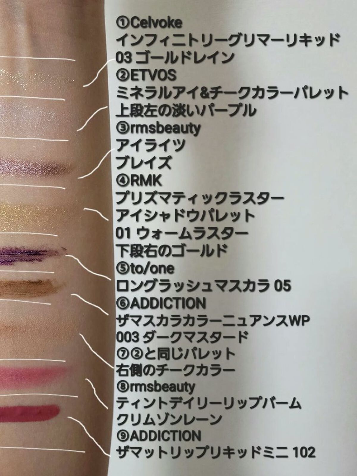 アイブロウは#whomeeのレッドブラウンを使用。 アイメイクは①#アンドビーの#クリームアイシャドウ マスタードを上下の瞼に。 アイメイクは②#misshaの#グリッタープリズムシャドウマーブル #ストームプリズムを①に重ねて。 下瞼は全体ではなく、黒目下にだけ✨ アイメイクは③#hinceの#ニューアンビエンスカラーアイライナー #エクレクティックを4枚目のように三角形に入れる。 チークは⑤#bisouの#ダイヤモンドグロウ マーズをほんのり✨ リップは⑥①のマスタードを塗った後に#celvokeの#エンスロールマットリップス 03を💋
