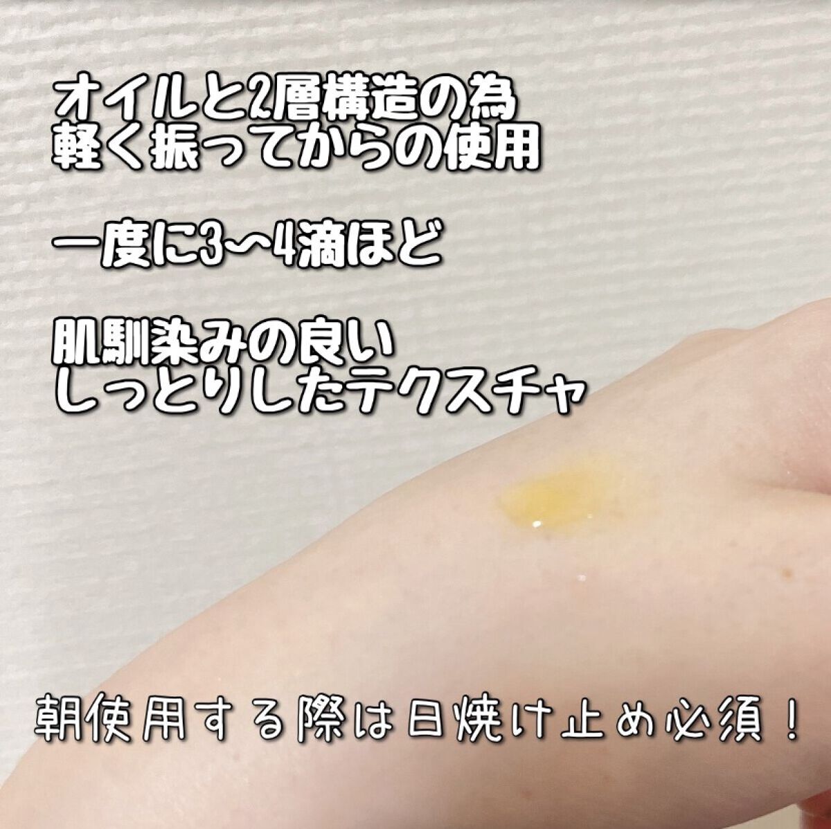 ビタミンEやヒアルロン酸も入った肌の抗酸化ケアができる美容液。ビタミンの酸化を防ぐため、特殊容器に入っていて、2層構造のオイル膜になっています。 サラサラなオイルみたいなテクスチャーです。つけたてはベタつきは感じますが、すぐサラっとするので使いやすい。 シワ改善、美白効果を期待しつつ、今から美白対策用に使用しています。