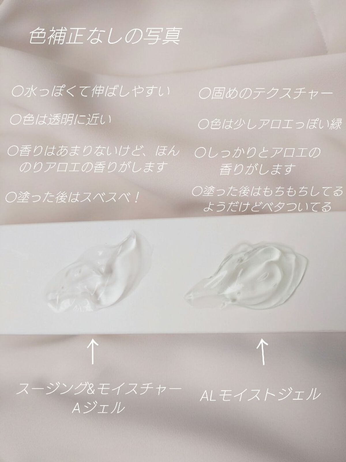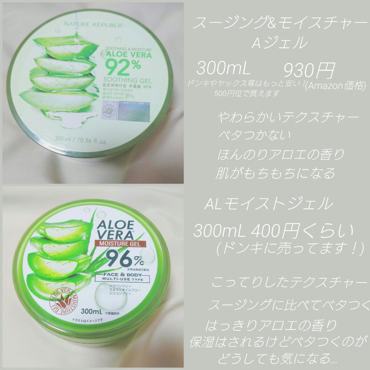 96%の方は、保湿はもちろんされるのですがベタつきが多く…ベタベタが嫌いな私は少し不満げに、でもアロエジェル様だしなぁ…と思いながら渋々使ってました(._.`)(とにかく足をトゥルトゥルにしたい欲が強かった為) 底が見え始めた頃、LIPSを入れ「これもしかして求めてたアロエジェルじゃないな…?」と、ようやく気付きました笑速攻薬局へ向かうと正品印のある92%をGET!✊🏻´- めっちゃやわらかいテクスチャー!!!!!めっちゃ伸びがいい!!!仕上がりスベスベ!!!!!!これだあああ!!と感極まって、今はリピ3個目に突入しました✌️ 96%に比べると、本当に違いが凄くて今までのはなんだったんだ…と思うくらいです 他の方の口コミを見てみると、96%で高評価されてる方が多かったので多分私には合わなかったんだと思います これからは92%一筋でいきます・*・:≡(ε:)