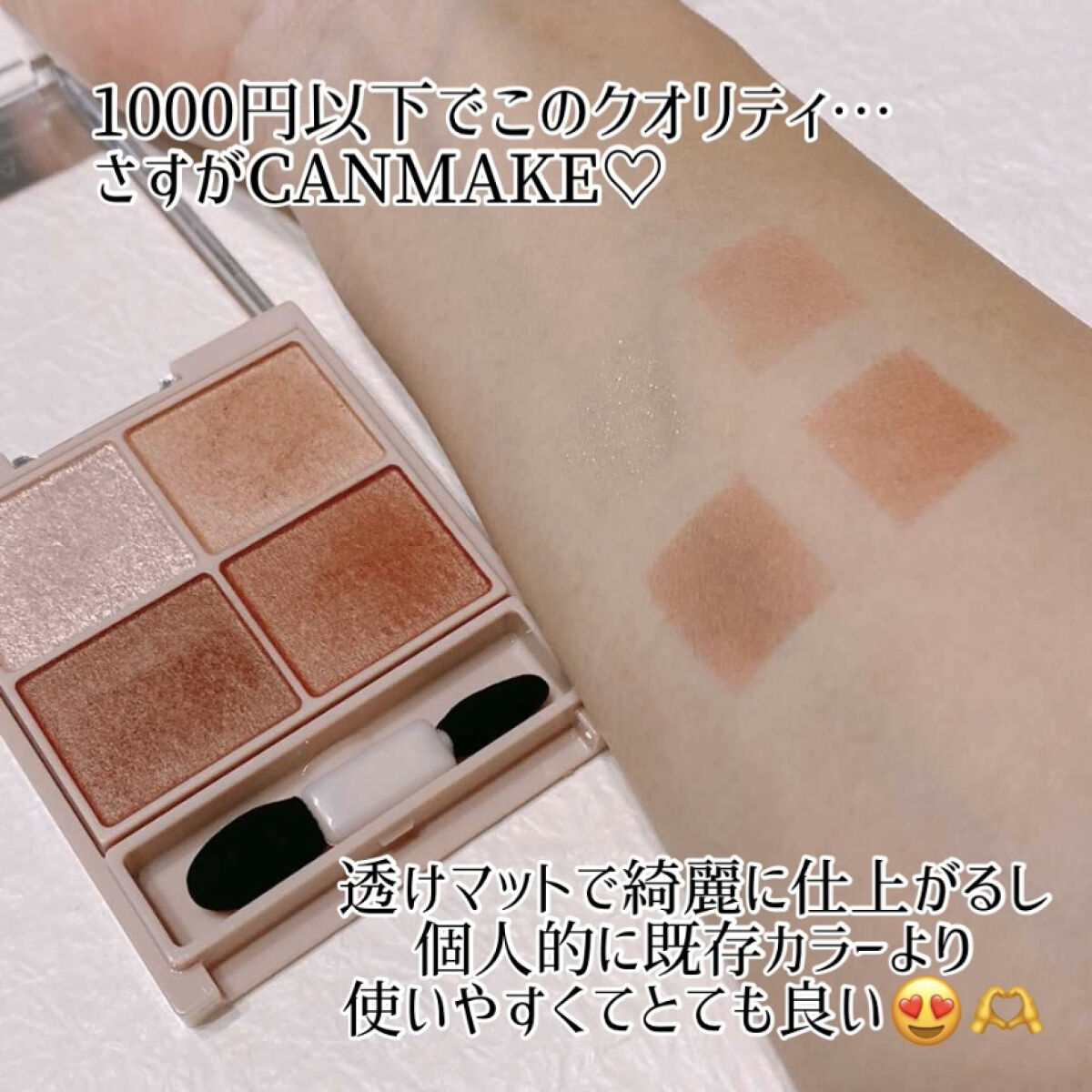 粉質もデパコスに劣らないと思う⭐️ 何より手に取りやすい価格帯が嬉しい キャンメイクへのときめきは今も強い‼️ お小遣いやバイト代から買ったキャンメイクの方がなんか特別感があったな 肌に溶け込むような透けマットシャドウ。 シルキースフレアイズの姉妹品。