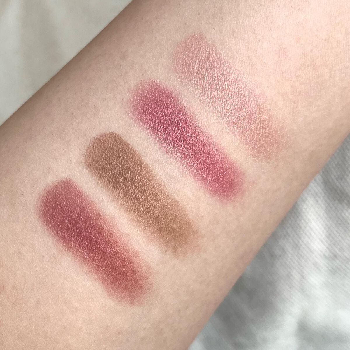 プライマーを使って、密度の高い感じのブラシで 左下ローズを置くように塗る。 ぼかすのは境目だけにして、しっかり色を出す。 右下のダークブラウンと思っていた濃い色は メイクしてみたら結構紫っぽく出たんですが これがまぁくすみ感が強くて…w くすみは何より苦手だよ😂😂 右上のラメはぺかっと光るのがとっても良い!!🤩 割とシンプルなメイクになるな~と思うけど しっかり色出せたので無事使っていけそうです💃🏼💓