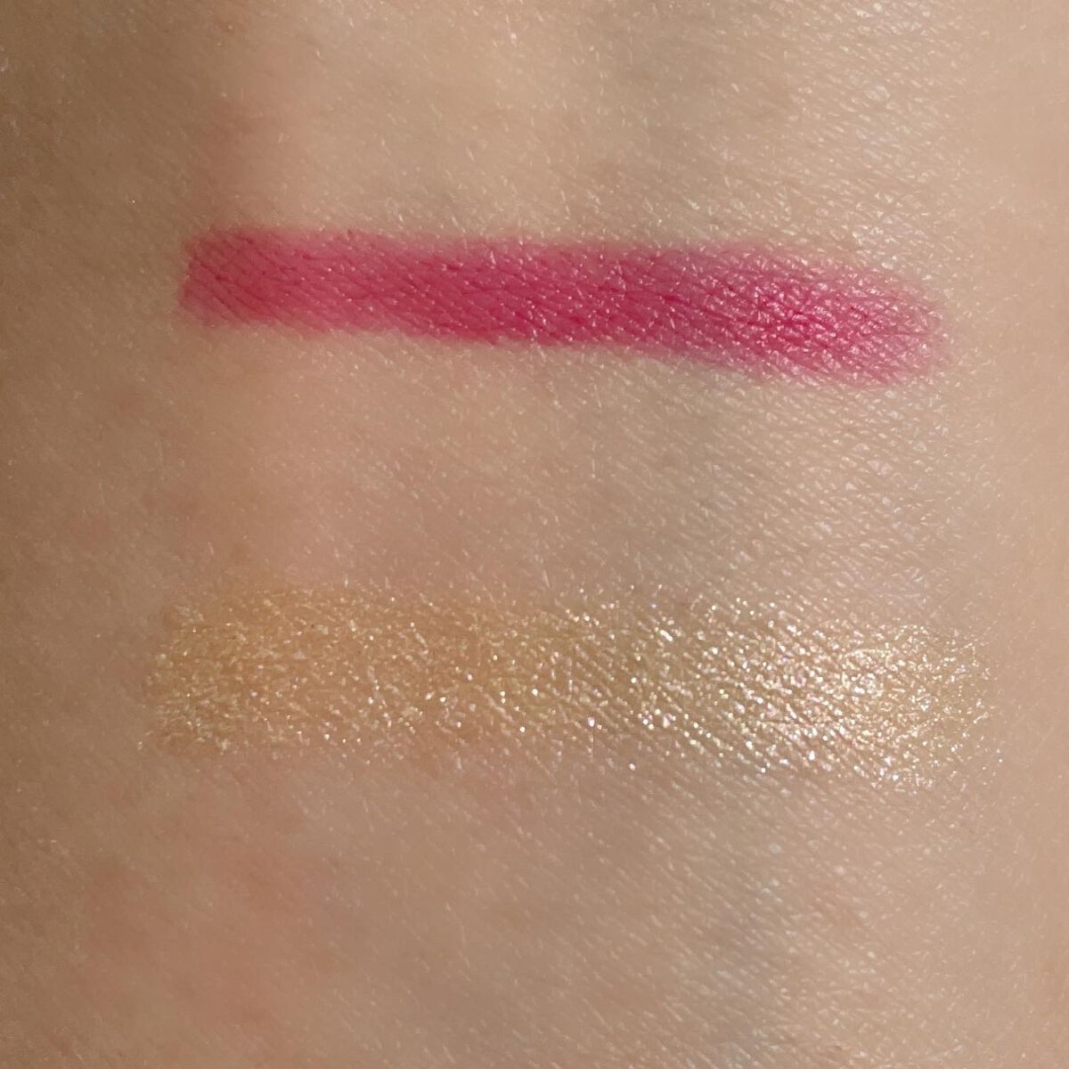 唇にのせるとキラキラはしますが、色味はないですが…個人的に単品でつけると 血色の悪い唇になってしまうので 手持ちのリップにプラスした方が、可愛いと思います💗 肌馴染みがよく、使いやすい色です☺️ ピンクがかった赤でゴールドラメがキラキラと美しいです💖 発色もよく使いやすい色だと思います☺️ ラメが光の角度できらめいて、また違う印象に見え美しいです❤️ テクスチャーは軽めで、アプリケーターも小ぶりで塗りやいです! 香りはレッドベリー・フローラル・バニラ・ムスクの甘い香りがしますが、甘い香りが苦手な私でも、キツくなく心地よく使用できました☺️