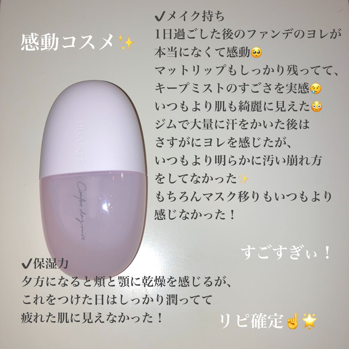 ✔️メイク持ち1日過ごした後のファンデのヨレが本当になくて感動🥺マットリップもしっかり残ってて、キープミストのすごさを実感しました😢いつもより肌も綺麗に見えて不思議でした😳 ✔️保湿力混合肌で夕方になると頬と顎に乾燥を感じますが、これをつけた日はしっかり潤ってて疲れた肌に見えませんでした!キープ力だけではなく保湿力もあるとか最高すぎィ! ✔️匂いアロマティックグリーンフローラル調の心やすらぐ、デコルテ様の香りに癒されます🍀使うたびにリフレッシュ効果あり! ✔️見た目かわいい丸いフォルムで、手にフィットします。持ち運びもしやすい♪ ✔️コスパデパコスにしてはそこまで高くないのがいいですね◎