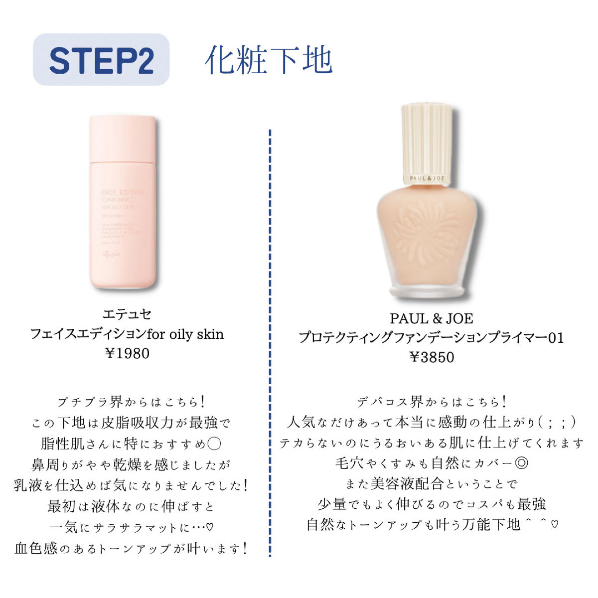 肌が綺麗と褒めてもらえるベースメイクを紹介します♡ 皮脂崩れ防止とトーンアップに注力! ettusaisフェイスエディションスキンベースフォーオイリースキン→ 暑い時や運動する時など特に汗をかきそうな日に PAUL & JOE BEAUTEプロテクティング ファンデーション プライマー→ 普段使い〜お出かけの時までオールマイティ the SAEMカバーパーフェクション チップコンシーラー キャンメイクマシュマロフィニッシュパウダーML マットライトオークル→ 急いでる時や軽く外に出る時は下地なしでこれだけでも🥺 innisfreeノーセバム ミネラルパウダー N → 特に崩れやすいところに部分使い(おでこ、鼻周り、マスクの端に当たる部分) 肌が綺麗だと自分の気持ちも上がるし全体的なメイクの仕上がりも綺麗に見えます🤍