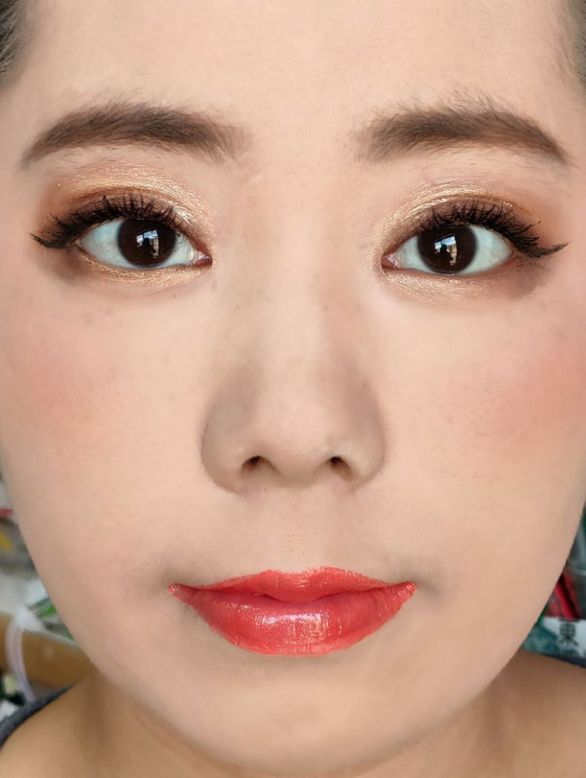 アリィー ニュアンスチェンジUV ジェル RSを、顔全体にまんべんなく塗ります。 RMK RMK ジェルクリーミィファンデーション 103を、顔全体にまんべんなく塗ります。 ジョンソンベビー ジョンソン ベビーパウダーを、顔全体にまんべんなく軽くはたきます。 THE BODY SHOP bronze shade warm glowを、両頬に塗ります。 KATE リフレクトミラーアイズ BR-1の締め色を、眉毛全体にまんべんなく塗ります。 URGLAM UR GLAMBLOOMING EYE COLOR PALETTE 01を、使用しました。 ちふれ リキッド アイライナー 筆ペンタイプ BK30 ブラックを、塗ります。 CEZANNE エアリーカールマスカラを、まつ毛全体にまんべんなく塗ります。 MAYBELLINE NEW YORK コロッサルボリュームエクスプレスを、まつ毛全体にまんべんなく塗ります。 MAYBELLINE NEW YORK SPステイ マットインク 135を、唇全体にまんべんなく塗ります。