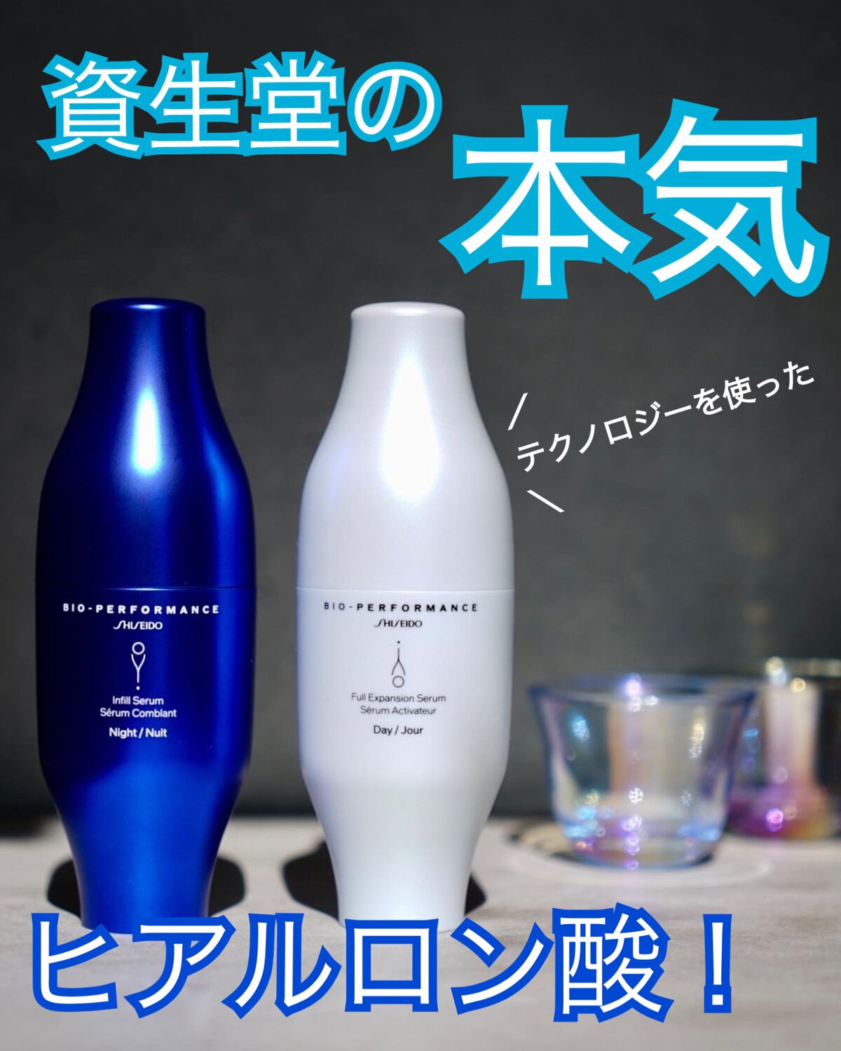 - ハリと弾力のあるうるおいで満ち満ちた肌へ導く美容液 ヒアルロン酸研究の長い歴史をもつ資生堂が、ヒアルロン酸分子の縮小化に成功。画期的なモレキュシフトテクノロジー搭載。 独自設計された夜と朝のセラムが効果的に働きあい、内側から輝くような、ハリと弾力のある、うるおいで満ち満ちた肌へ導きます。 乾燥による小ジワを目立たなくします。(効能評価試験済み) [内容] ・SHISEIDO ビオパフォーマンス インフィル セラム <夜用美容液> 30mL ・SHISEIDO ビオパフォーマンス フルエクスパンション セラム <朝用美容液> 30mL <使用上注意> ◇使い始めは、中味が出るまでディスペンサーを数回押してください。 ◇ご使用後は容器の口もとをきれいに拭き、必ずカバーキャップをきちんと閉めてください。 ◇中味衛生上、使用期間中はディスペンサーを容器から取り外さないでください。 ◇中味が出にくくなったら、容器をディスペンサーの口もと方向に傾け、手のひらで容器の底をトントンと叩いてください。 ◇低温下に置くと、中味が出にくくなることがあります。その場合は、しばらく室温に置いてからお使いください。 ◇ディスペンサーがスムーズに動かなくなった場合は、新しい本体をお求めください。 ◇日のあたるところや高温のところに置かないでください。 ◇火気にご注意ください。
