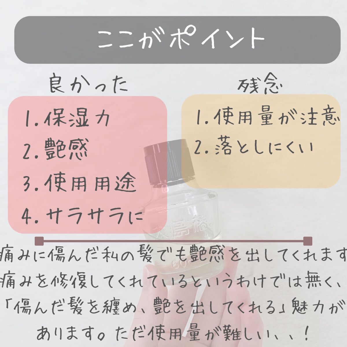 | ヘアケア・スタイリングランキング第62位 | 夏に浴びてしまった紫外線ダメージにも◎オイルというより美容液という感覚! | 詳細を見る | |